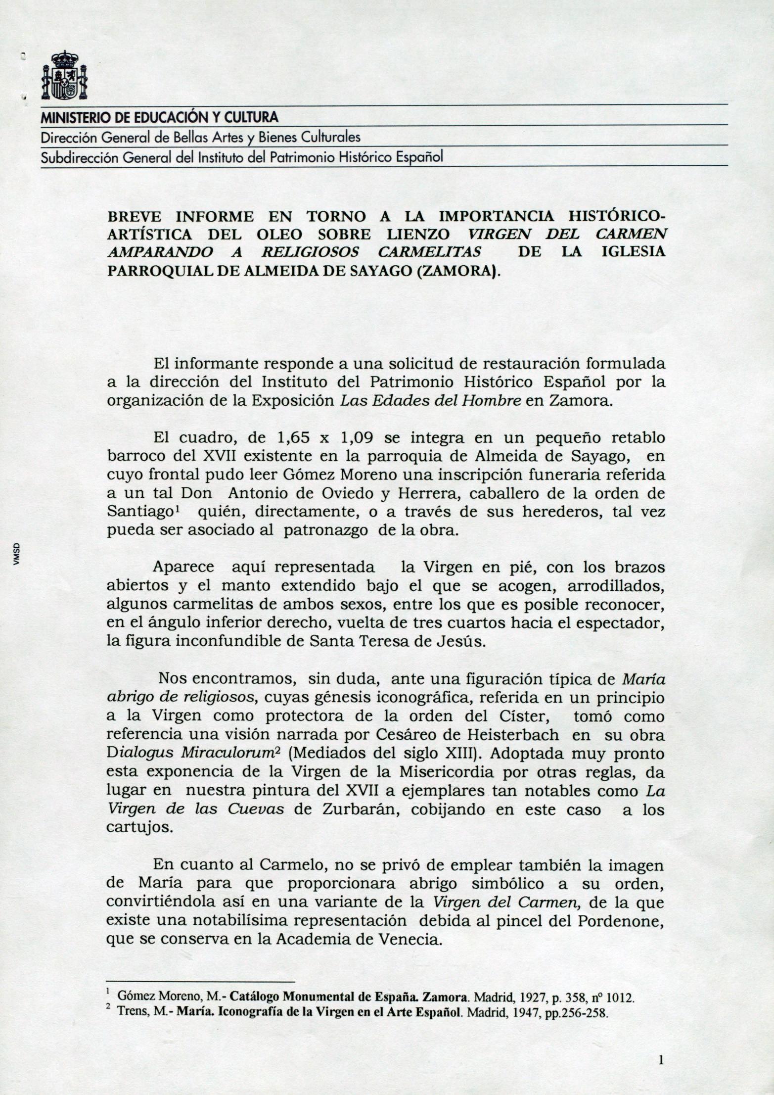 Informe histórico-artístico del óleo "Virgen del Carmen", atribuido a Juan Carreño de Miranda, procedente de la Iglesia parroquial de Almeida de Sayago (Zamora)