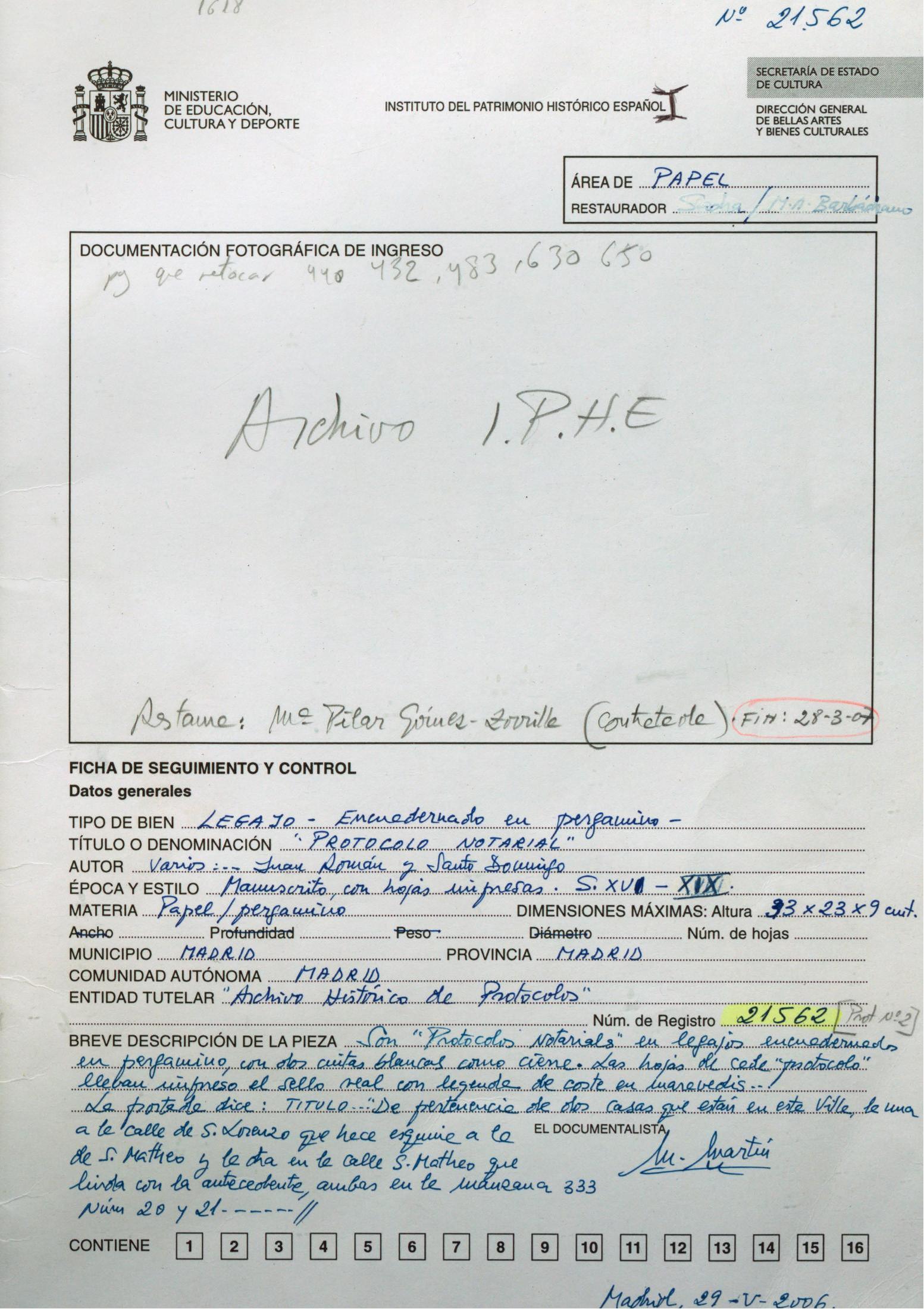 Restauración de dos protocolos notariales del siglo XVI procedentes del Archivo Histórico de Protocolos de Madrid