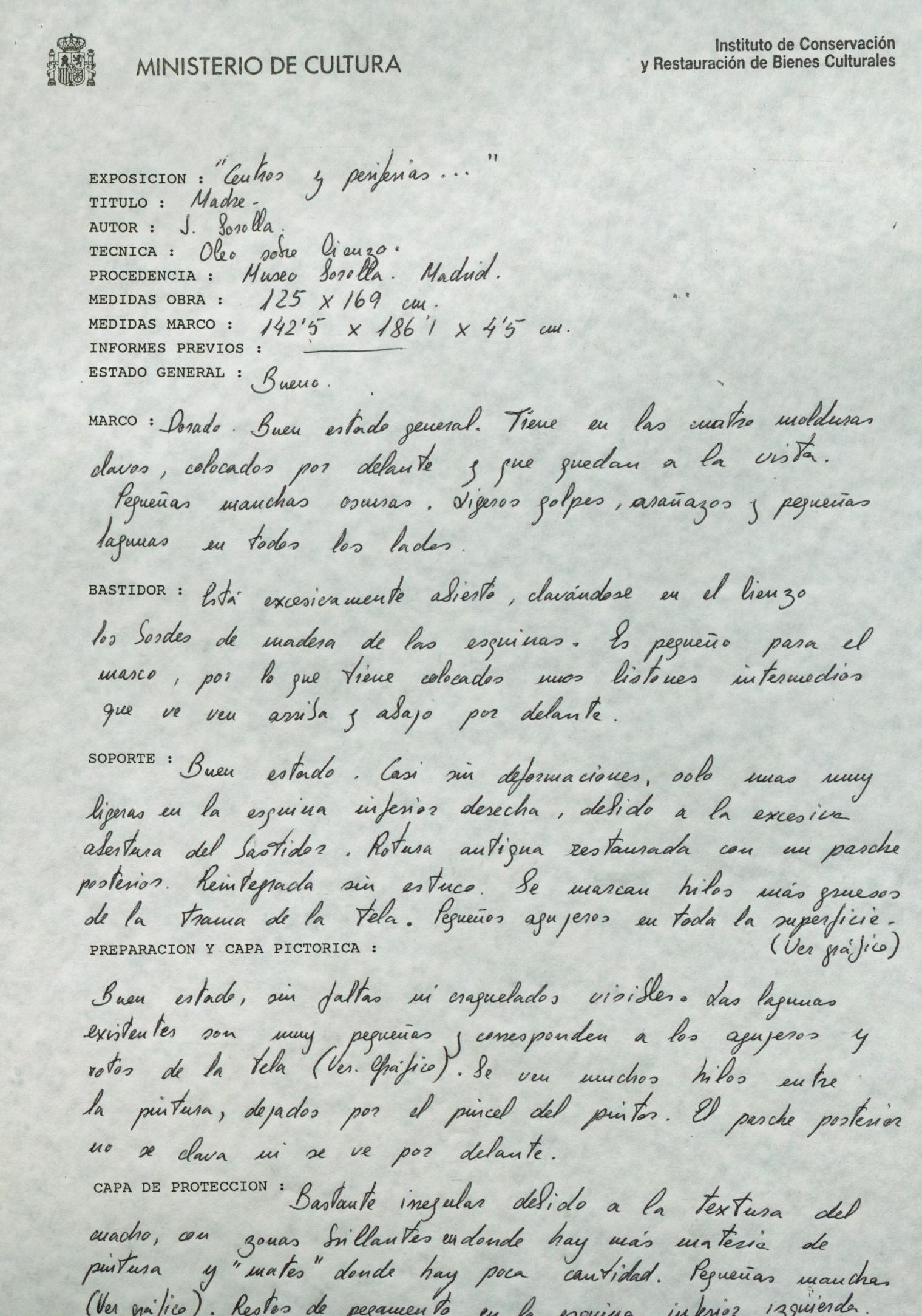 Informe de para conservación del lienzo "Madre", de Joaquín Sorolla, del Museo Sorolla (Madrid)