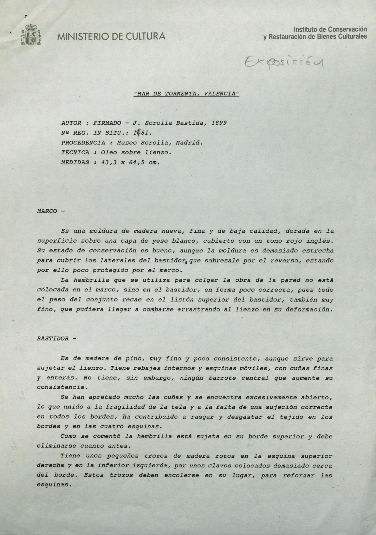 Informe de restauración del cuadro "Mar de tormenta, Valencia", de Joaquín Sorolla, del Museo Sorolla de Madrid