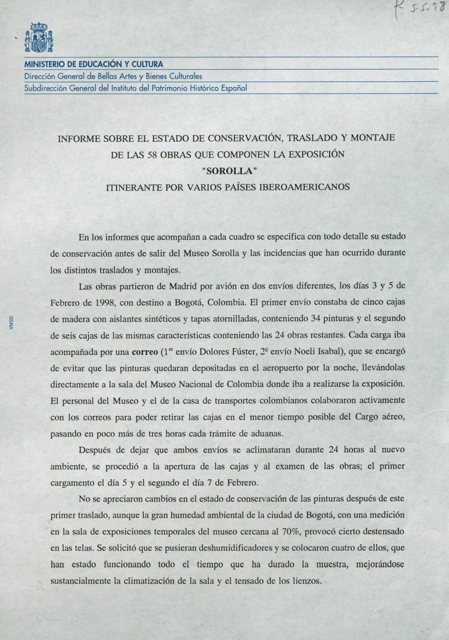 Informe sobre el estado de conservación, traslado y montaje de las cincuenta y ocho obras que componen la Exposición Sorolla itinerante del Museo Sorolla (Madrid)