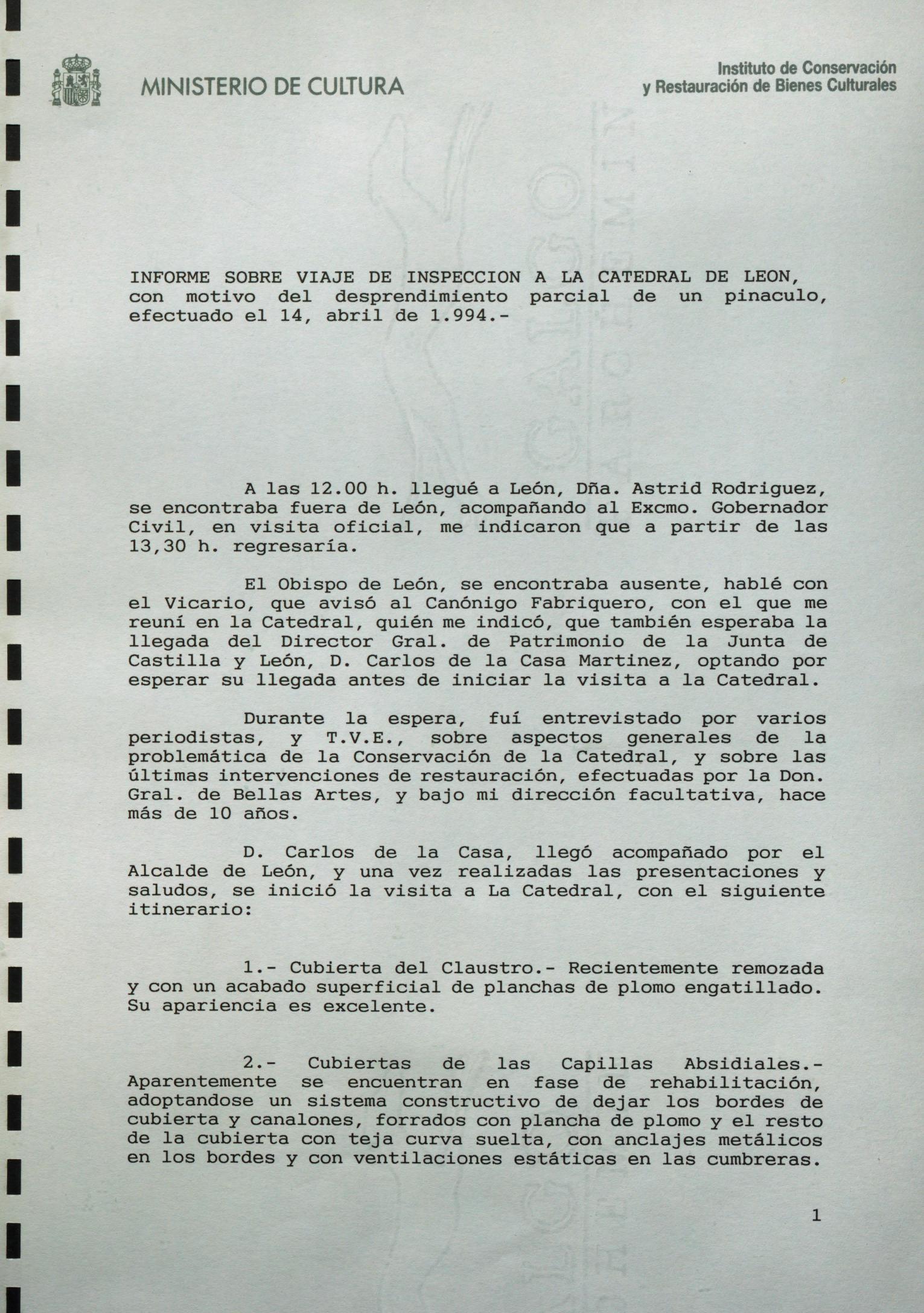 Informe de visita con motivo del desprendimiento parcial de un pináculo y revisión de las últimas restauraciones efectuadas en la Catedral de León