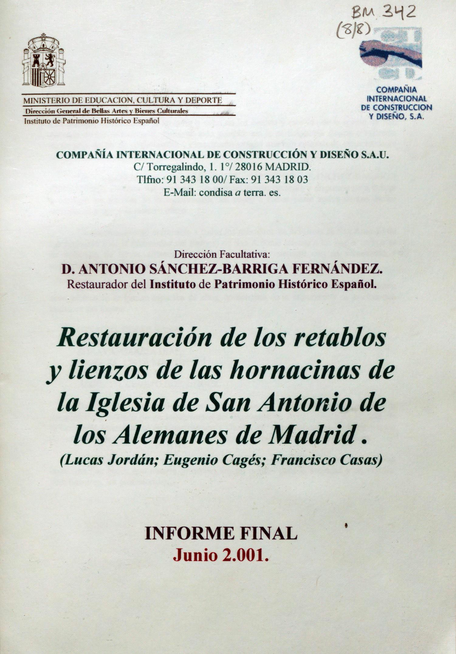 Restauración de lienzos y retablos, de Lucas Jordán, Eugenio Cagés y Francisco Casas, de la Iglesia de San Antonio de los Alemanes (Madrid)