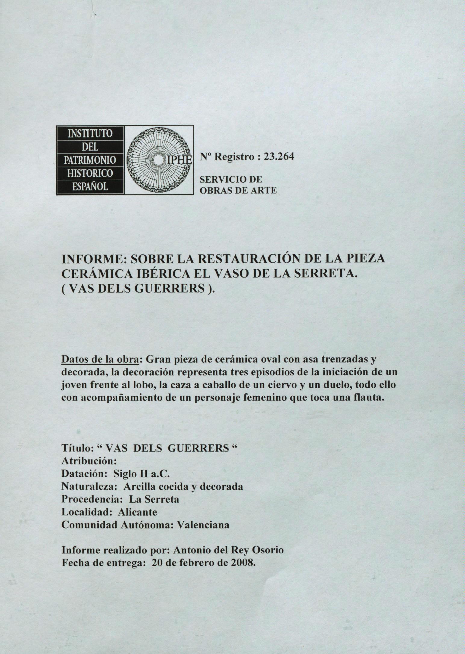 Restauración de la pieza cerámica ibérica "El vaso de la Serreta" o "Vas del guerrers", procedente del Museo de Alcoy (Alicante)