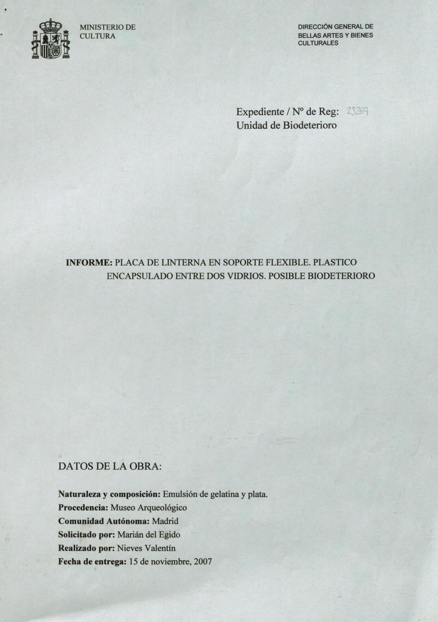 Informes de laboratorio y de deterioro y propuesta de conservación de una fotografía en placa de linterna procedente del Museo Arqueológico Nacional de Madrid