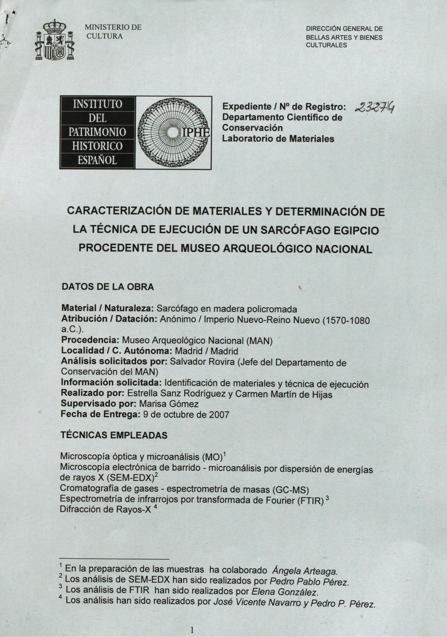 Informe de laboratorio para la caracterización de materiales y determinación de la técnica de ejecución de un sarcófago egipcio procedente del Museo Arqueológico Nacional de Madrid