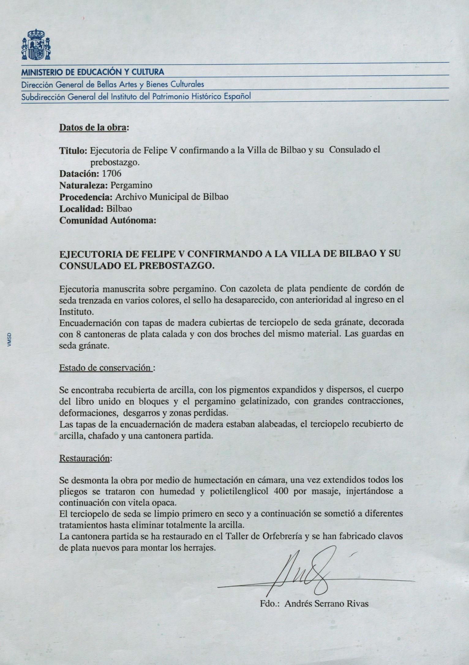 Restauración de tres "ejecutorias", de Felipe V, procedentes del Archivo Municipal de Bilbao