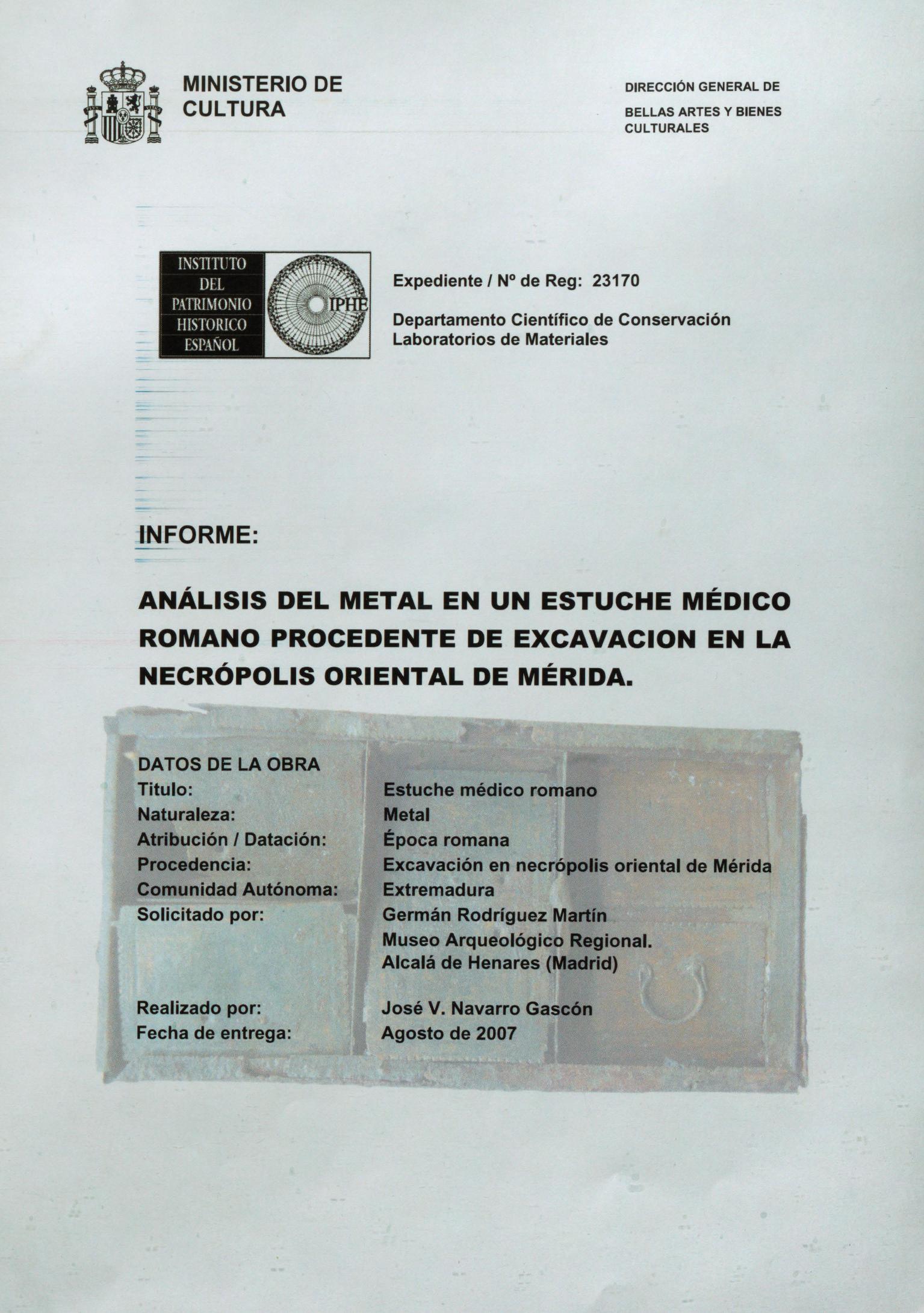 Informes sobre análisis de un estuche de médico de bronce romano, de metales y materiales contenidos y análisis radiográfico de cuatro cajitas con componentes farmacéuticos o medicinales, procedentes del Museo Arqueológico Regional de Madrid (Alcalá de Henares)