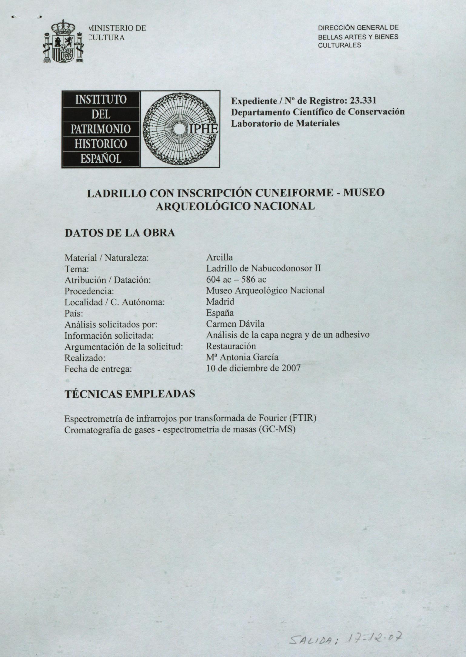 Informe de espectrometría y cromatografía de un ladrillo de arcilla o "Ladrillo de Nabucodonosor II" con inscripción cuneiforme, procedente del Museo Arqueológico Nacional de Madrid