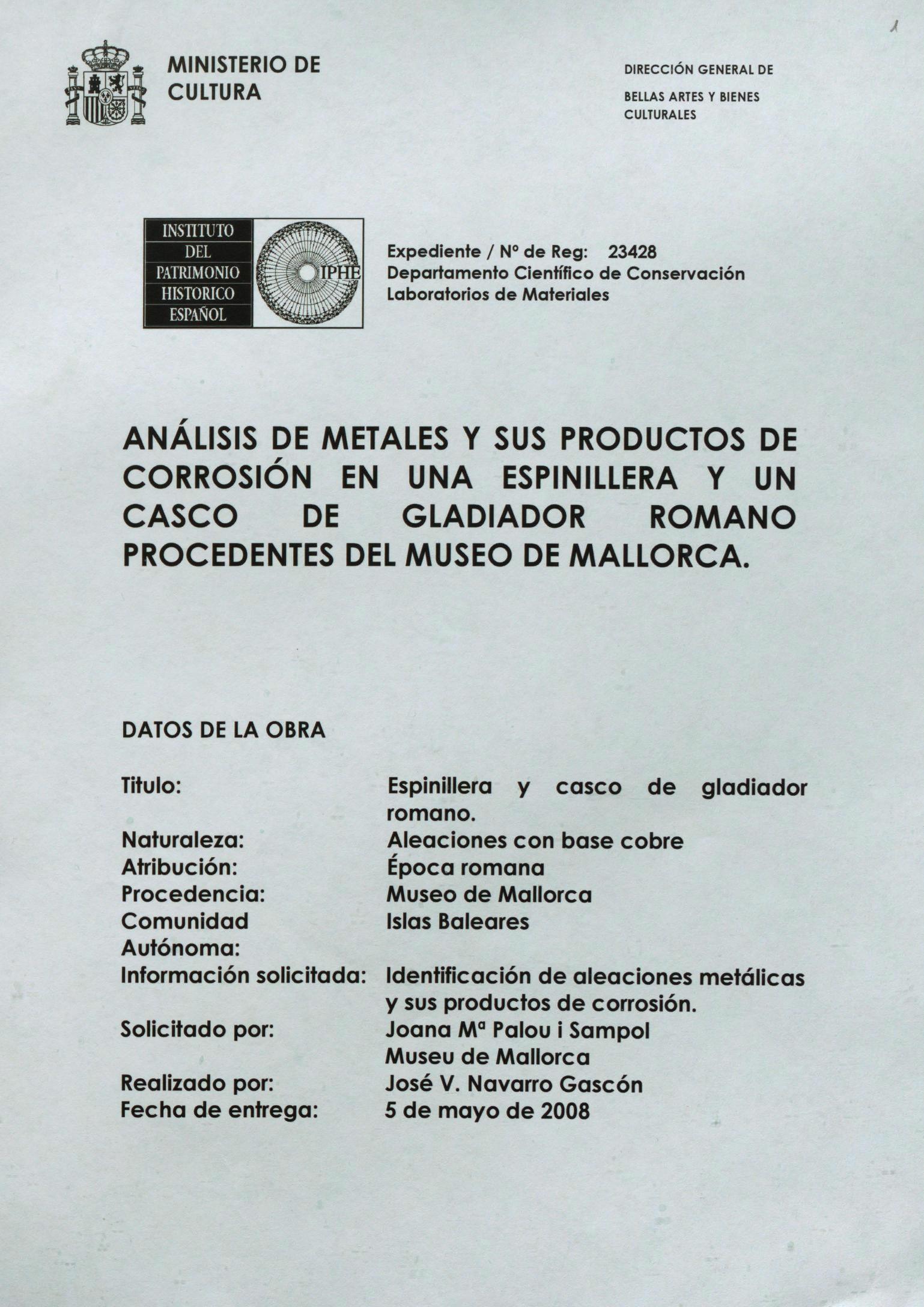 Informe sobre el análisis de metales y sus productos de corrosión de un casco de gladiador, una celada de casco y una espinillera de época romana, procedentes del Museo de Mallorca (Baleares)