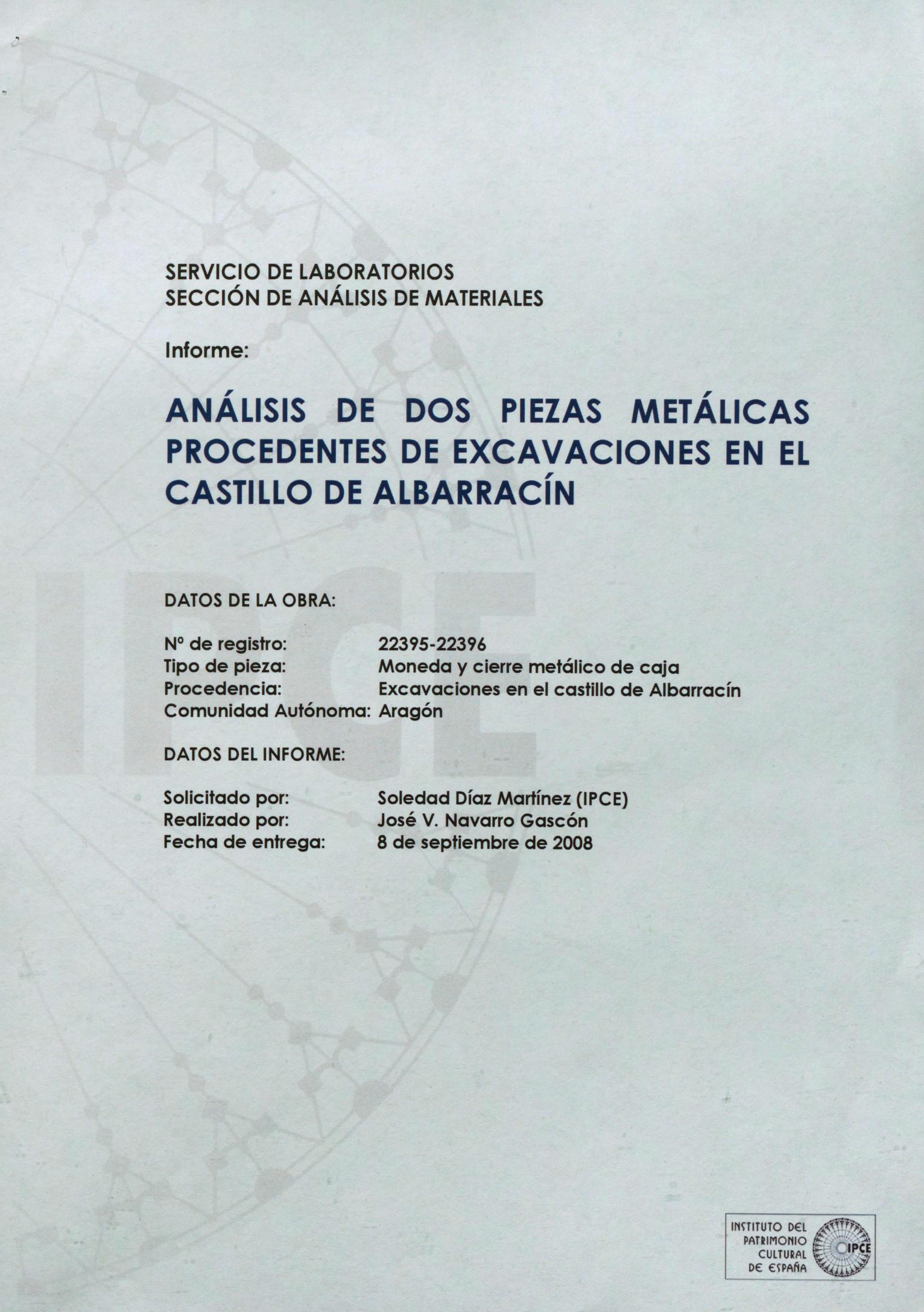 Informe de laboratorio de una moneda y un cierre metálico de caja hallados en las excavaciones arqueológicas del Castillo de Albarracín, procedentes del Museo de Albarracín (Teruel)