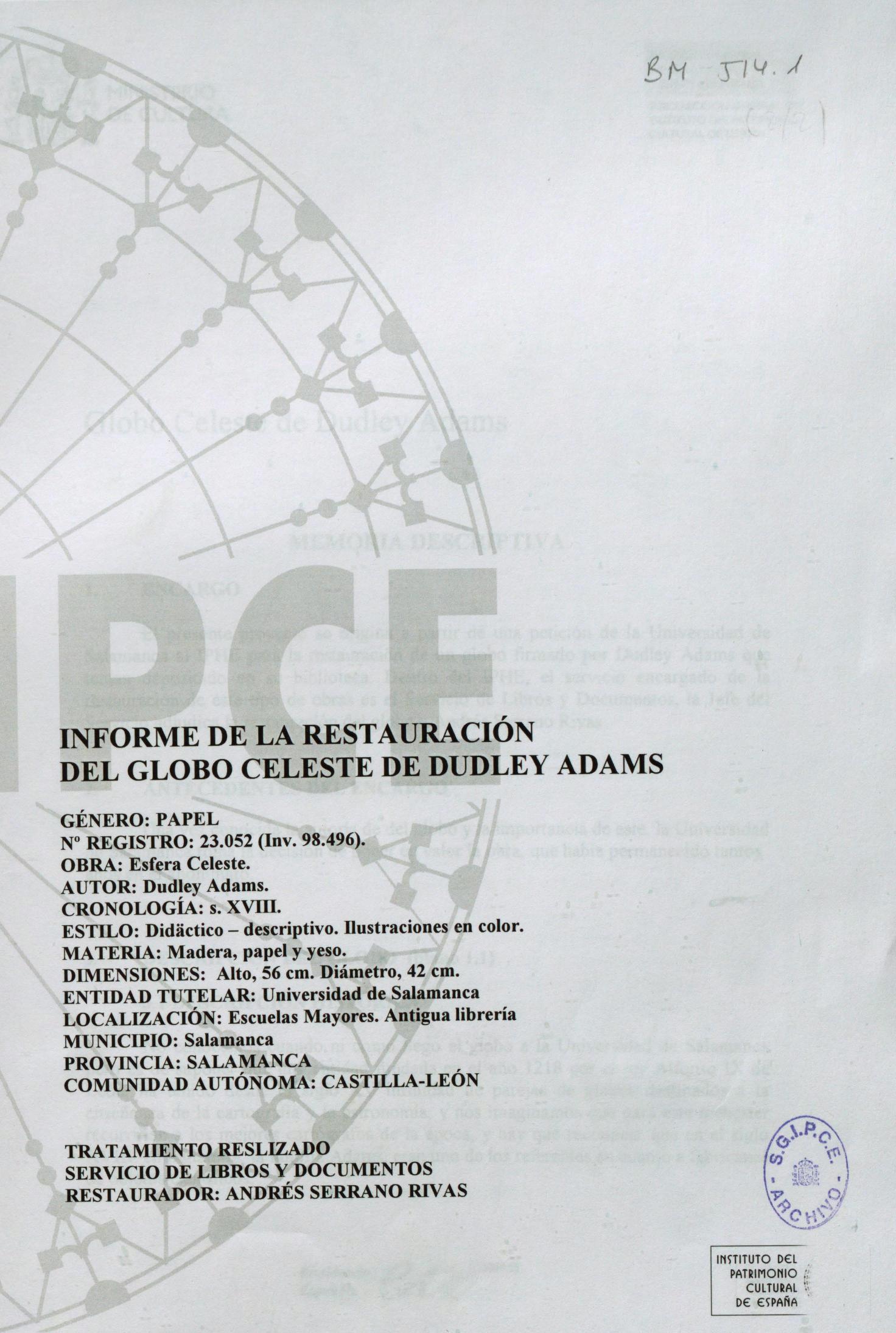 Restauración del globo o esfera celeste, de Dudley Adams, con leyenda en inglés procedente de la Biblioteca de la Universidad de Salamanca