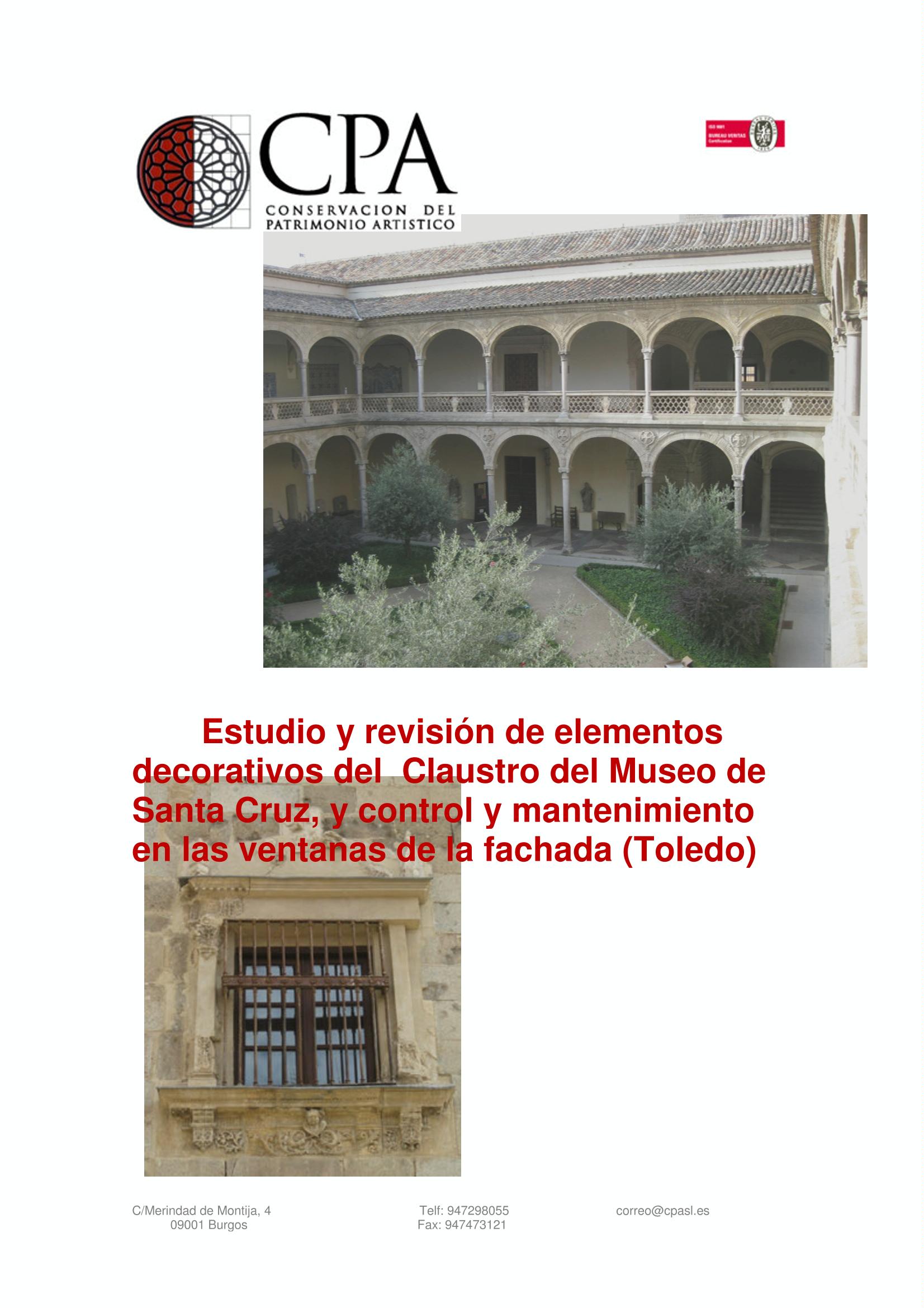 Informe sobre el estudio y revisión de elementos decorativos del claustro y control y mantenimiento de las ventanas de la fachada del Museo de Santa Cruz de Toledo