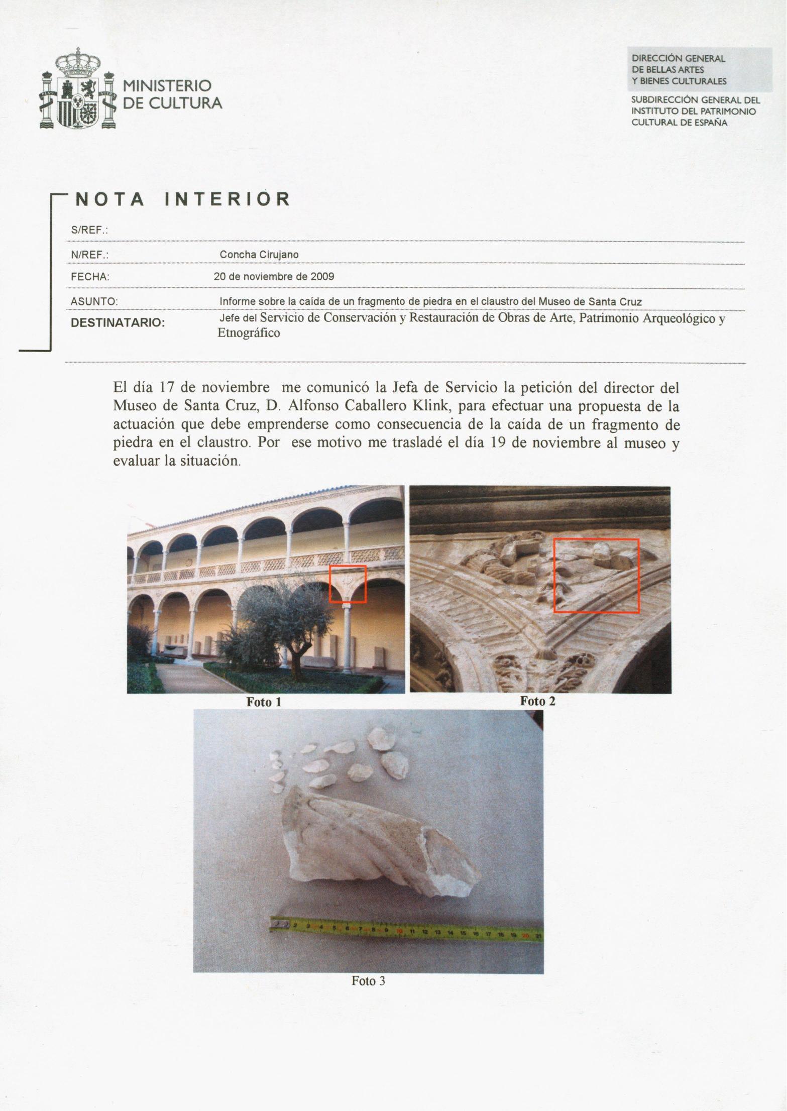 Informe sobre la caída de un fragmento de piedra en el claustro del Museo de Santa Cruz de Toledo