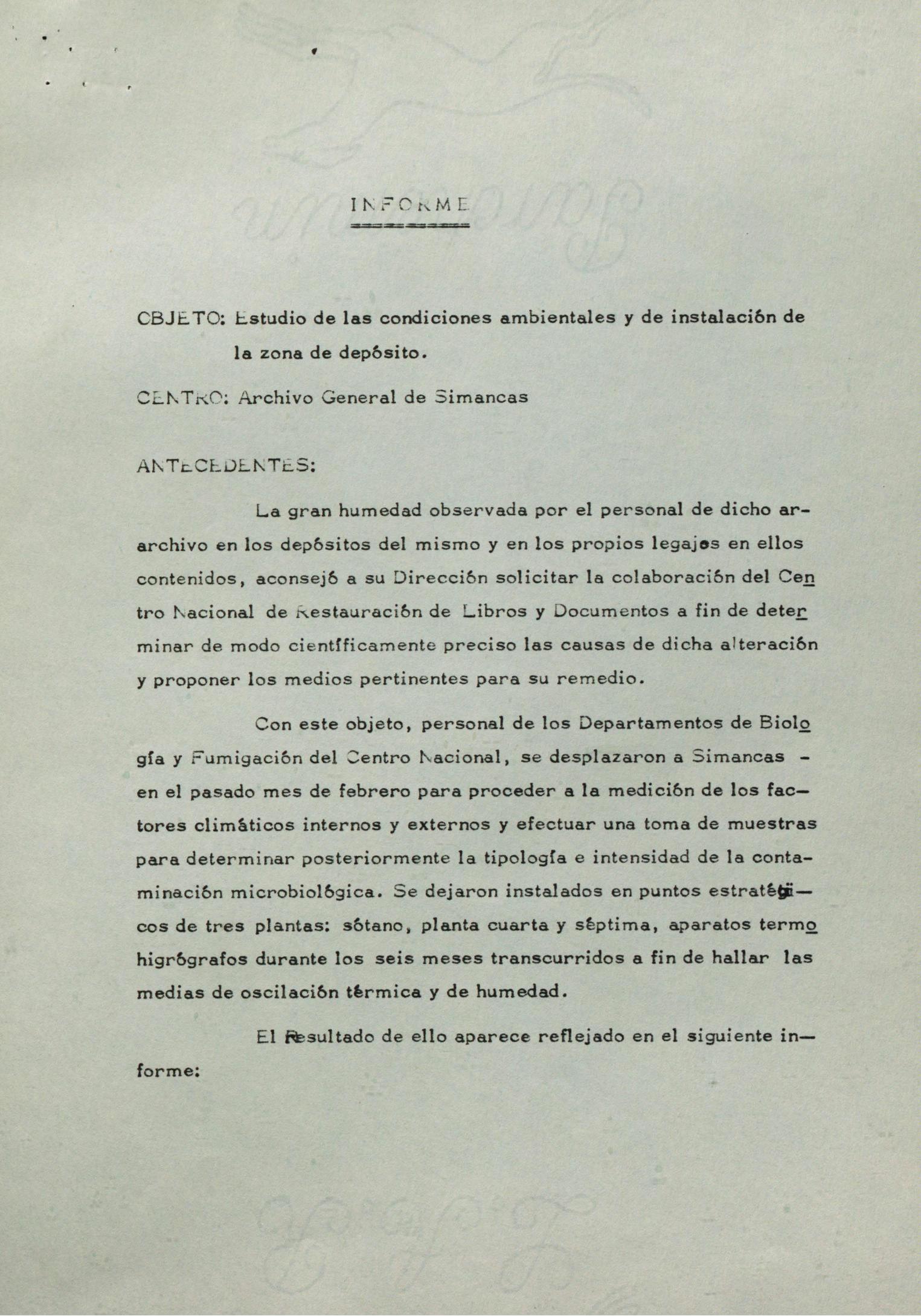 Informes sobre la situación de los fondos y contaminación biológica en el Archivo de Simancas (Valladolid)