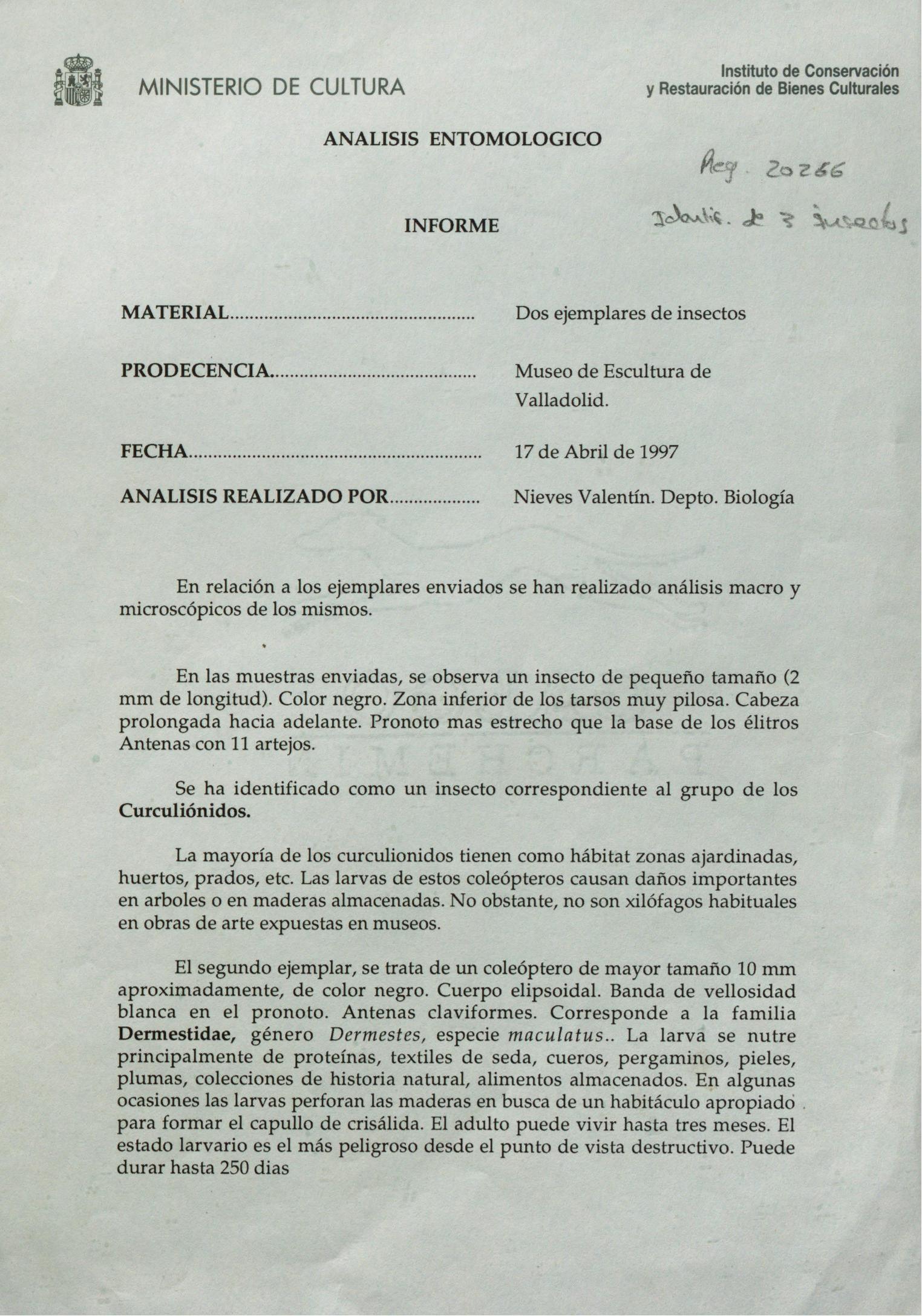 Informe sobre el análisis entomológico para la identificación de tres insectos procedentes del Museo Nacional de Escultura de Valladolid