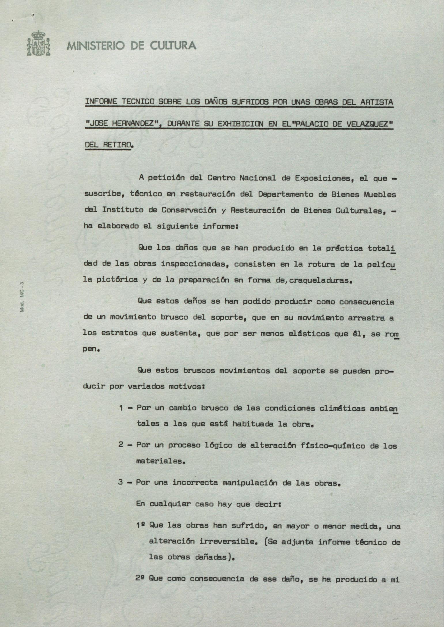 Informe sobre los daños sufridos por unas obras del artista José Fernández, durante su exhibición en el Palacio Velázquez del Retiro de Madrid