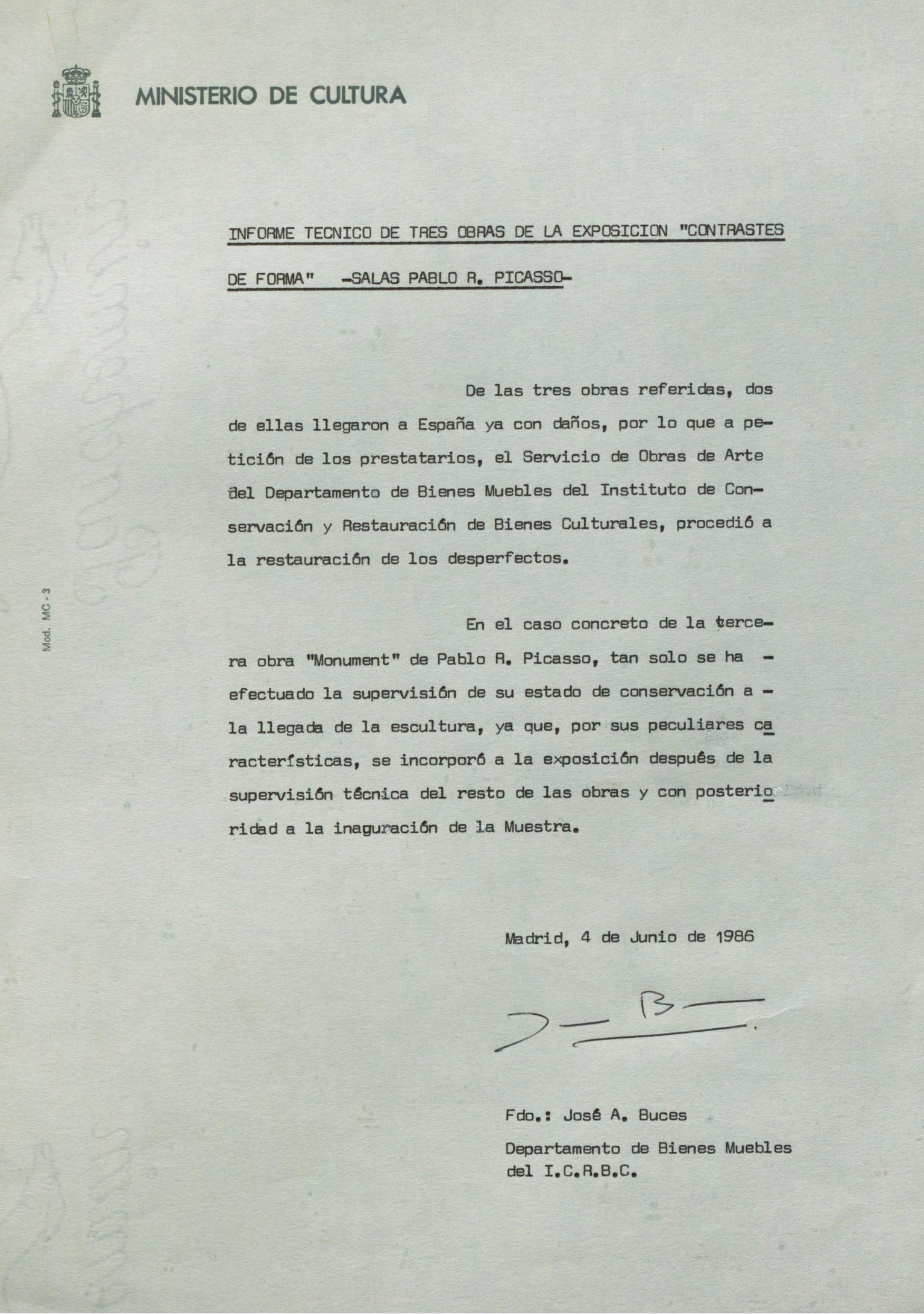 Informe de conservación de tres obras de la exposición "Contrastes de forma", en las Salas Pablo Picasso de la Biblioteca Nacional de España (Madrid)