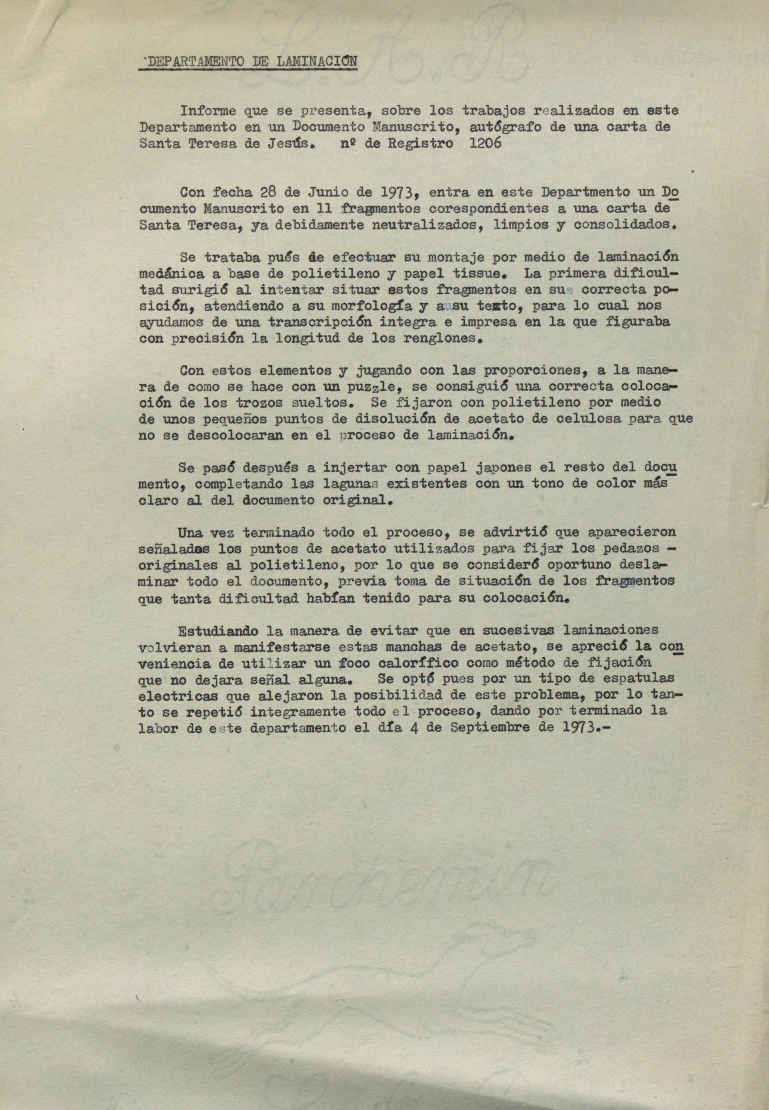 Restauración y tratamiento de laminación de un documento manuscrito autógrafo de Santa Teresa de Jesús