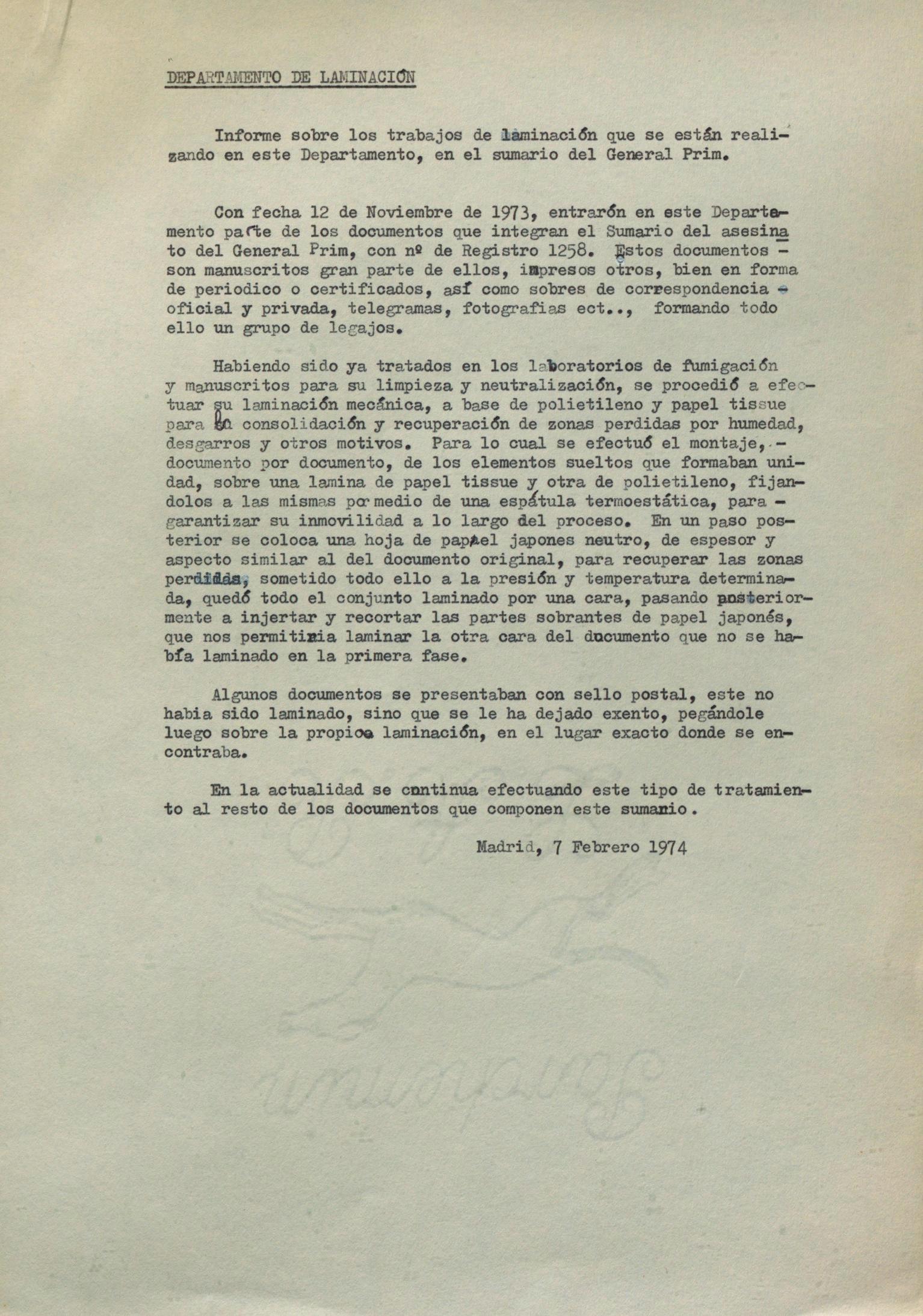 Restauración y tratamiento de laminación de un "Sumario" del General Prim procedente del Juzgado de Primera Instancia e Instrucción Primera de Madrid