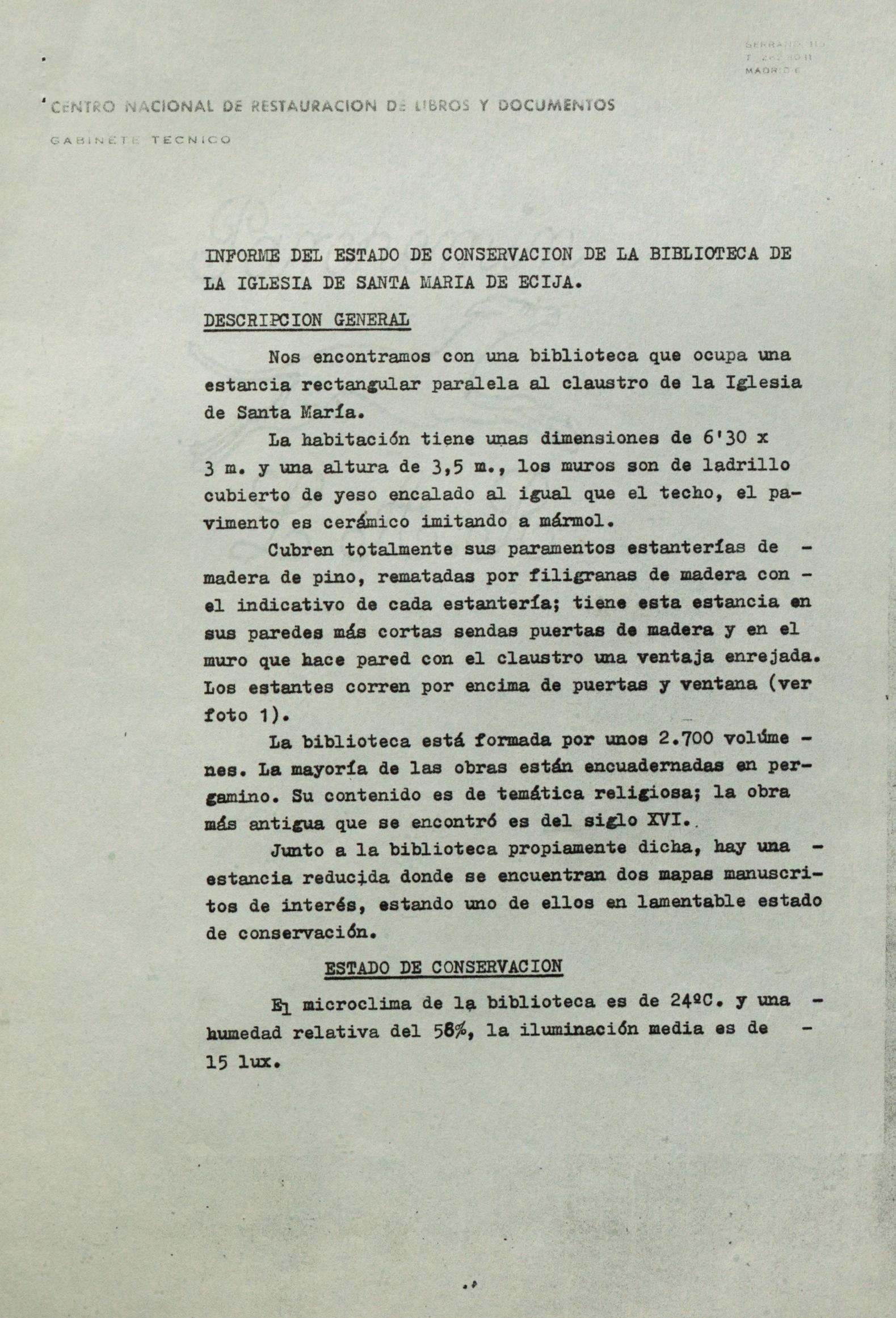 Informe de conservación de la biblioteca de la Iglesia de Santa María de Écija (Sevilla)
