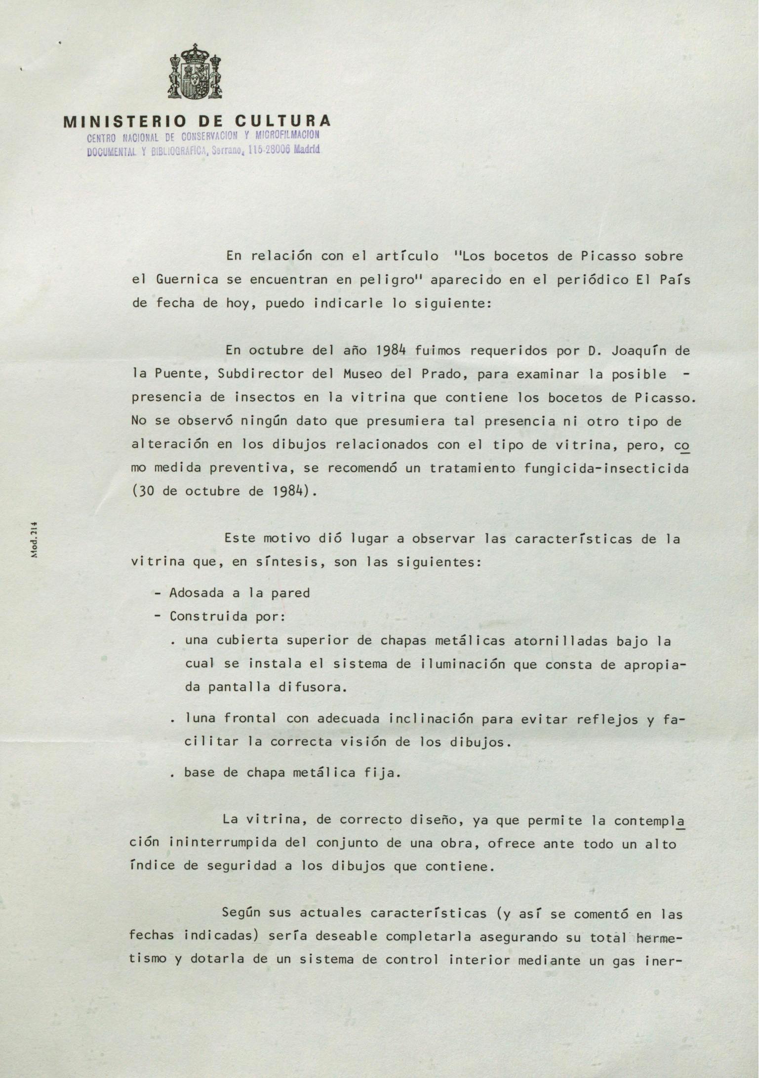 Informe de visita sobre la vitrina en la que se encuentran instalados los bocetos del "Guernica" de Picasso, en el Casón del Buen Retiro de Madrid