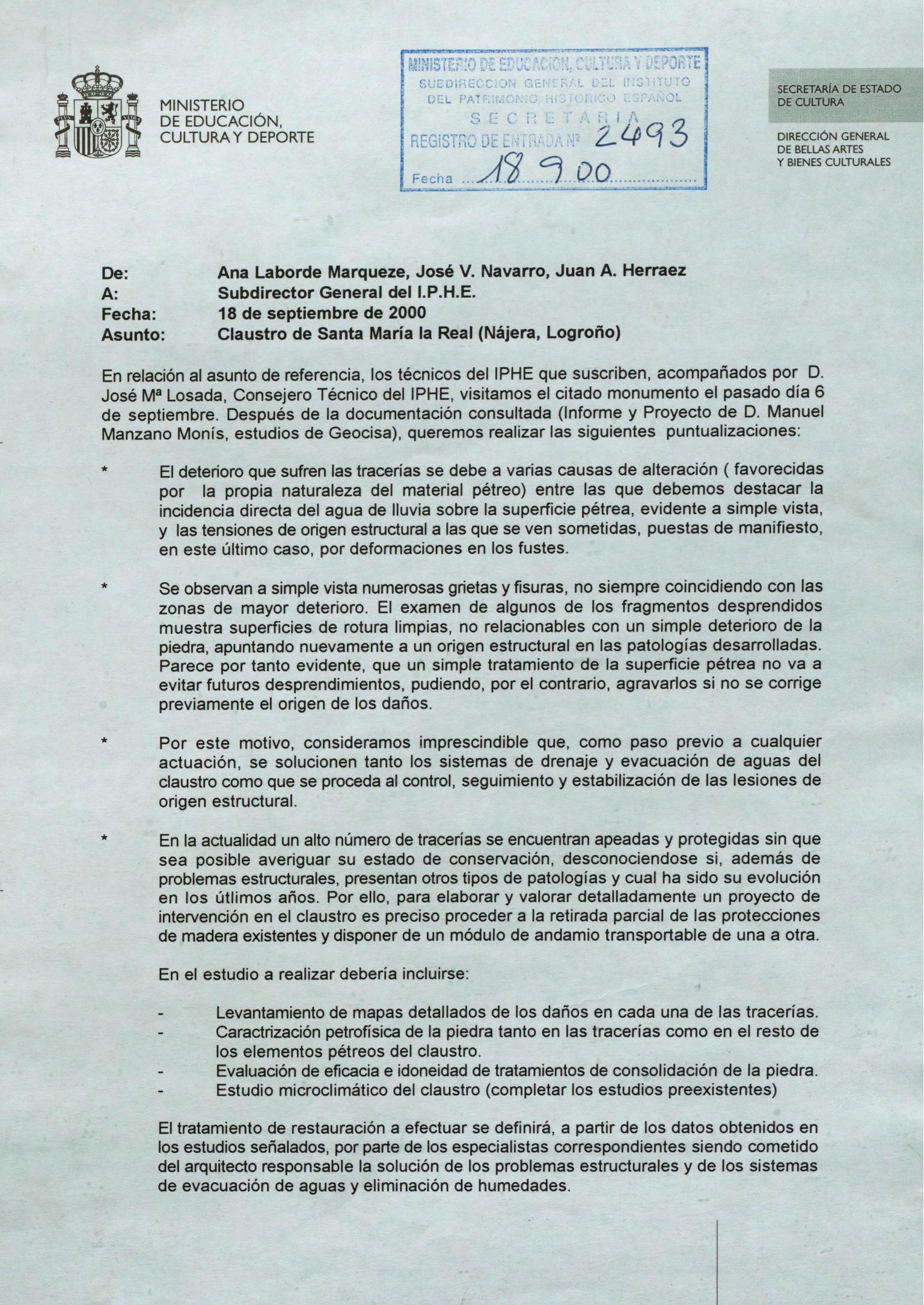 Informe de visita y propuesta de tratamiento de las tracerías del claustro de Santa María la Real de Nájera (La Rioja)