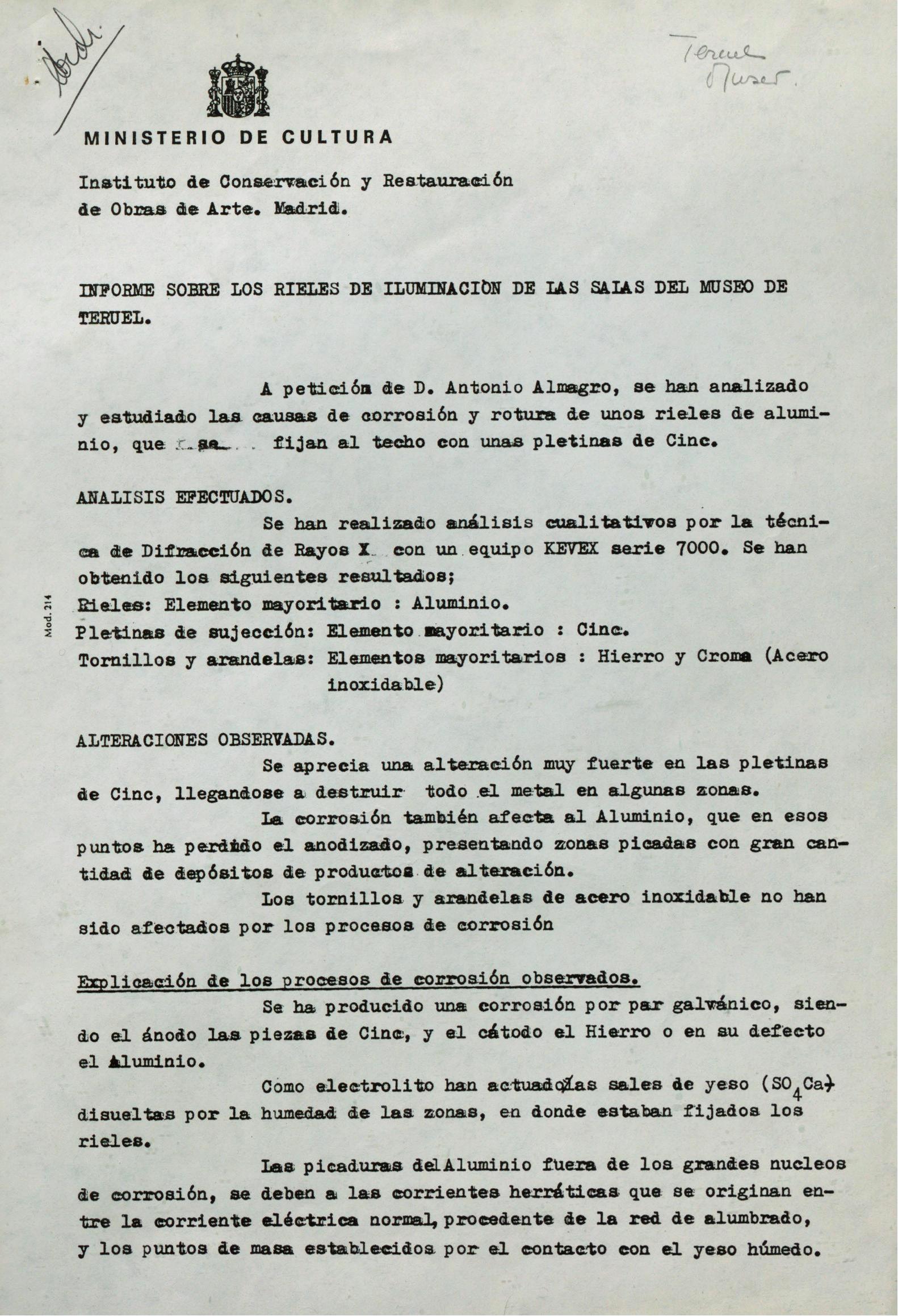 Informe sobre los rieles de iluminación de las salas del Museo de Teruel