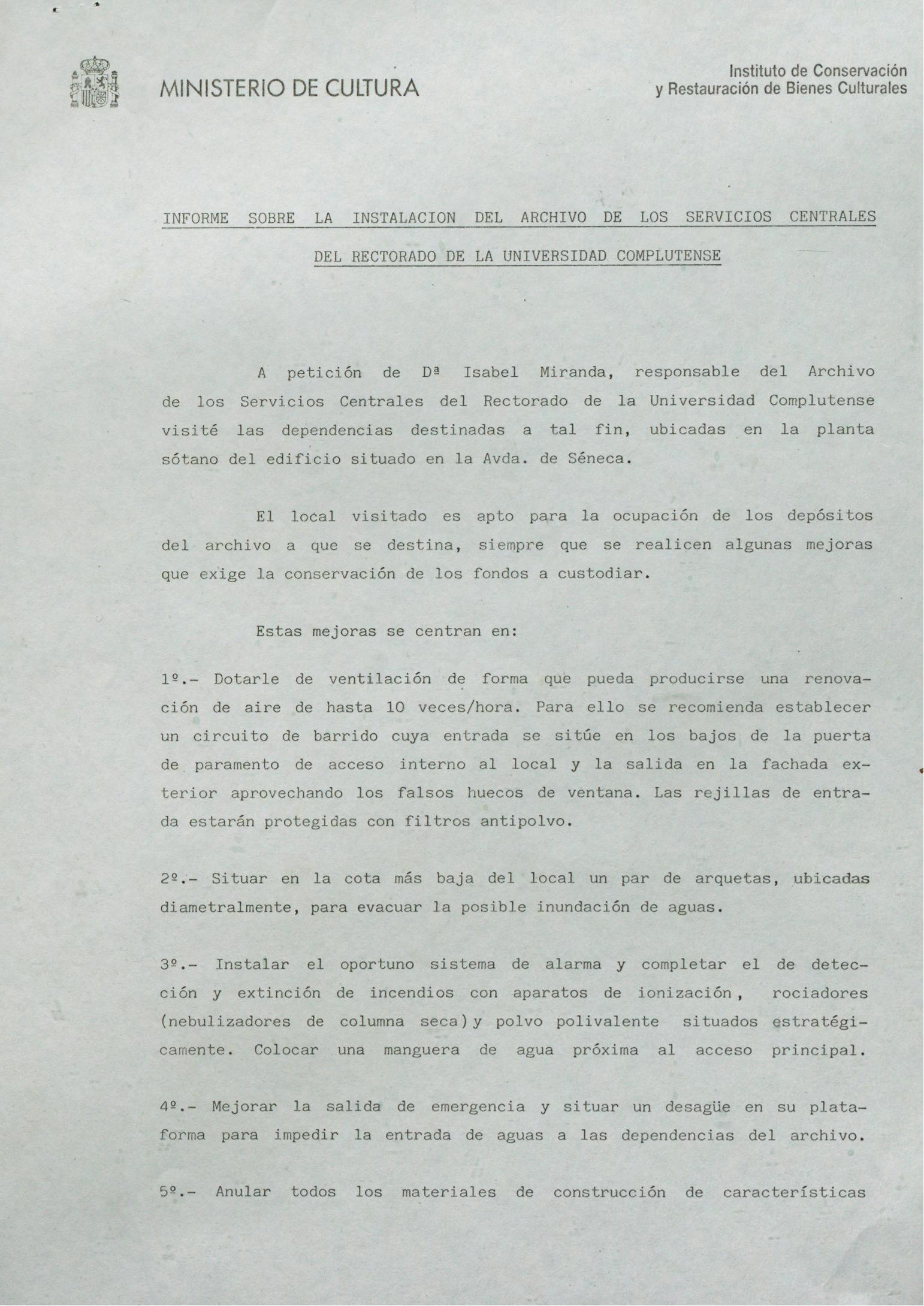 Informe sobre la instalación del archivo de los servicios centrales del rectorado de la Universidad Complutense de Madrid