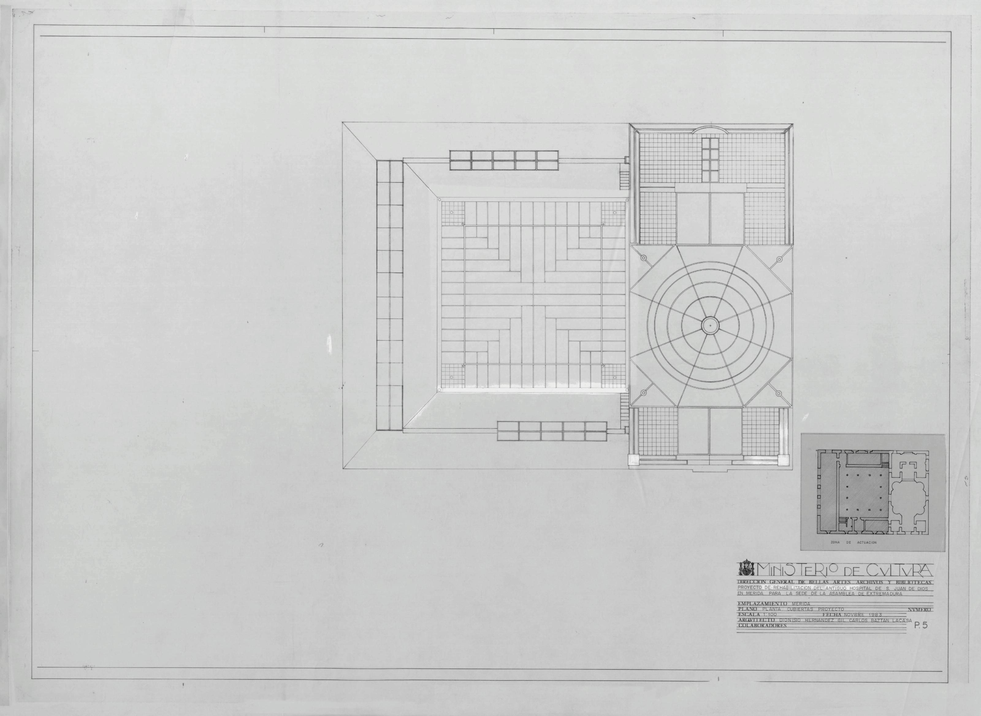 ASAMBLEA DE EXTREMADURA PROYECTO DE REHABILITACIÓN DEL ANTIGUO HOSPITAL DE S. JUAN DE DIOS PARA SEDE DE LA ASAMBLEA: PLANTA DE CUBIERTAS PROYECTO Sin notas ni cotas Con despiece de solados y bóvedas Con dibujo a pequeña escala determinando zona de actuación. Sin firmar