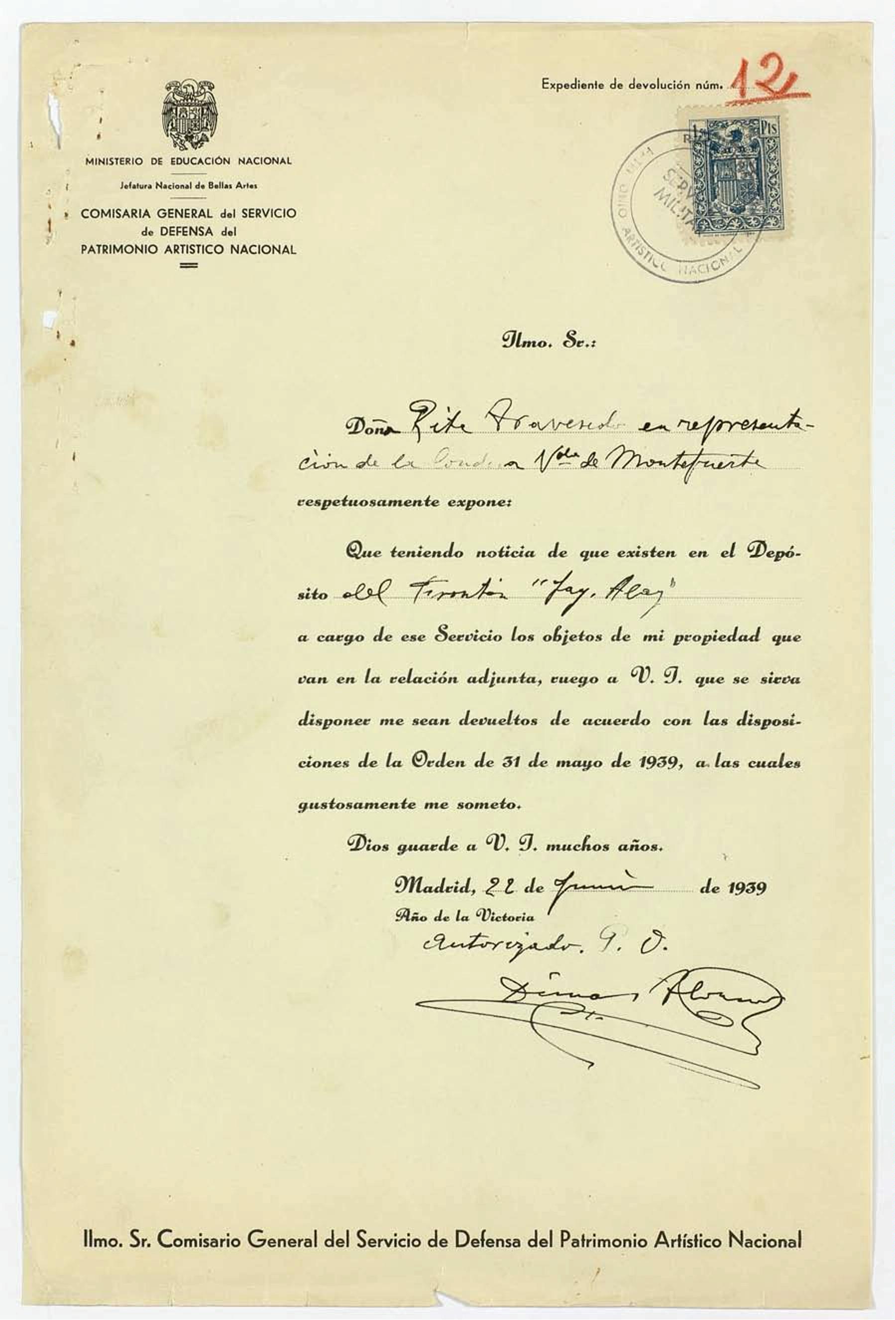 Expediente de devolución de María Azpiroz y Carrión, condesa viuda de Montefuerte