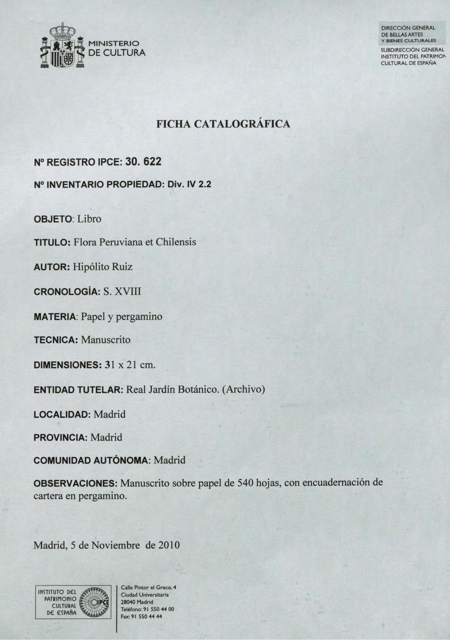 Restauración del libro manuscrito "Flora peruviana" del siglo XVIII, de Hipólito Ruiz Pavón, procedente de la Biblioteca del Real Jardín Botánico (Madrid)