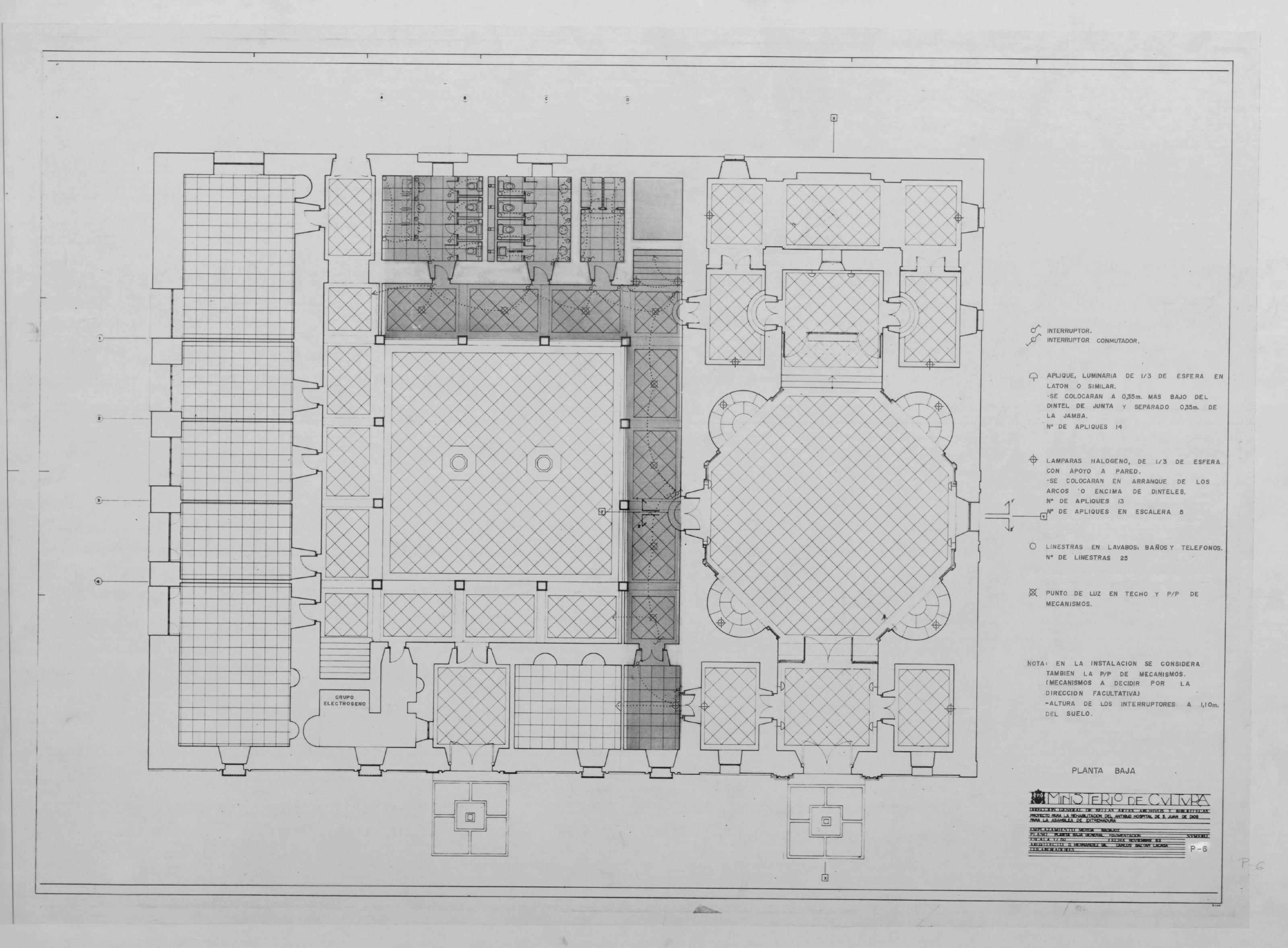 ASAMBLEA DE EXTREMADURA PROYECTO DE REHABILITACIÓN DEL ANTIGUO HOSPITAL DE S. JUAN DE DIOS PARA SEDE DE LA ASAMBLEA: PLANTA BAJA GENERAL ELECTRICIDAD Sobre copia de p. Baja pavimentación Con símbolos conectados representando los diferentes mecanismos y leyenda y situación del grupo electrógeno Sin firmar