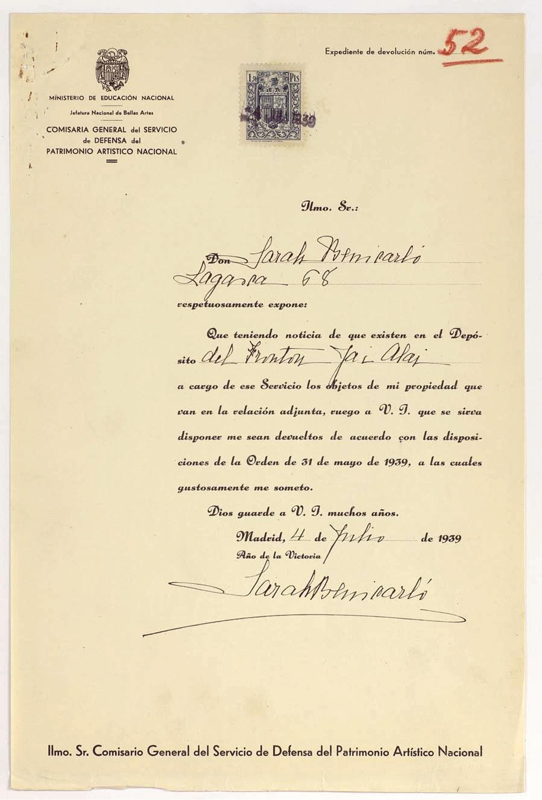 Expediente de devolución de Sarah Benicarló, marquesa de Benicarló