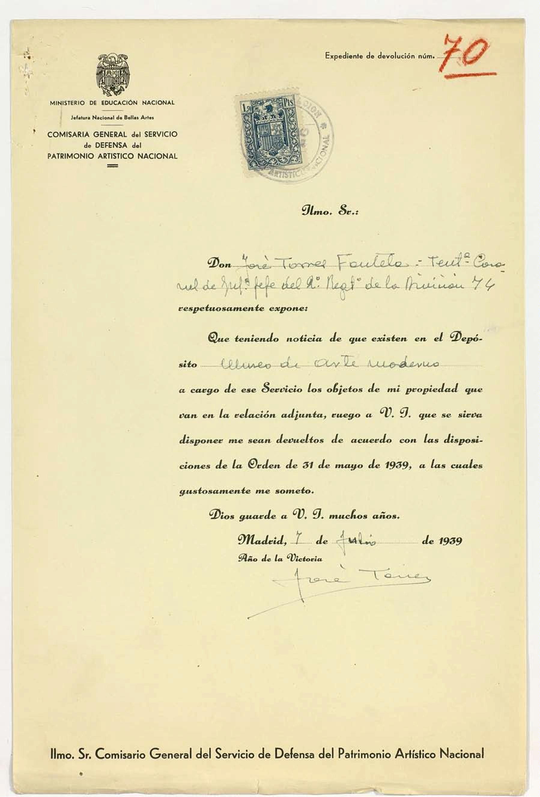 Expediente de devolución de José Torres Fontela, teniente coronel de Infantería, Jefe del 2º Rgto. de la División 74