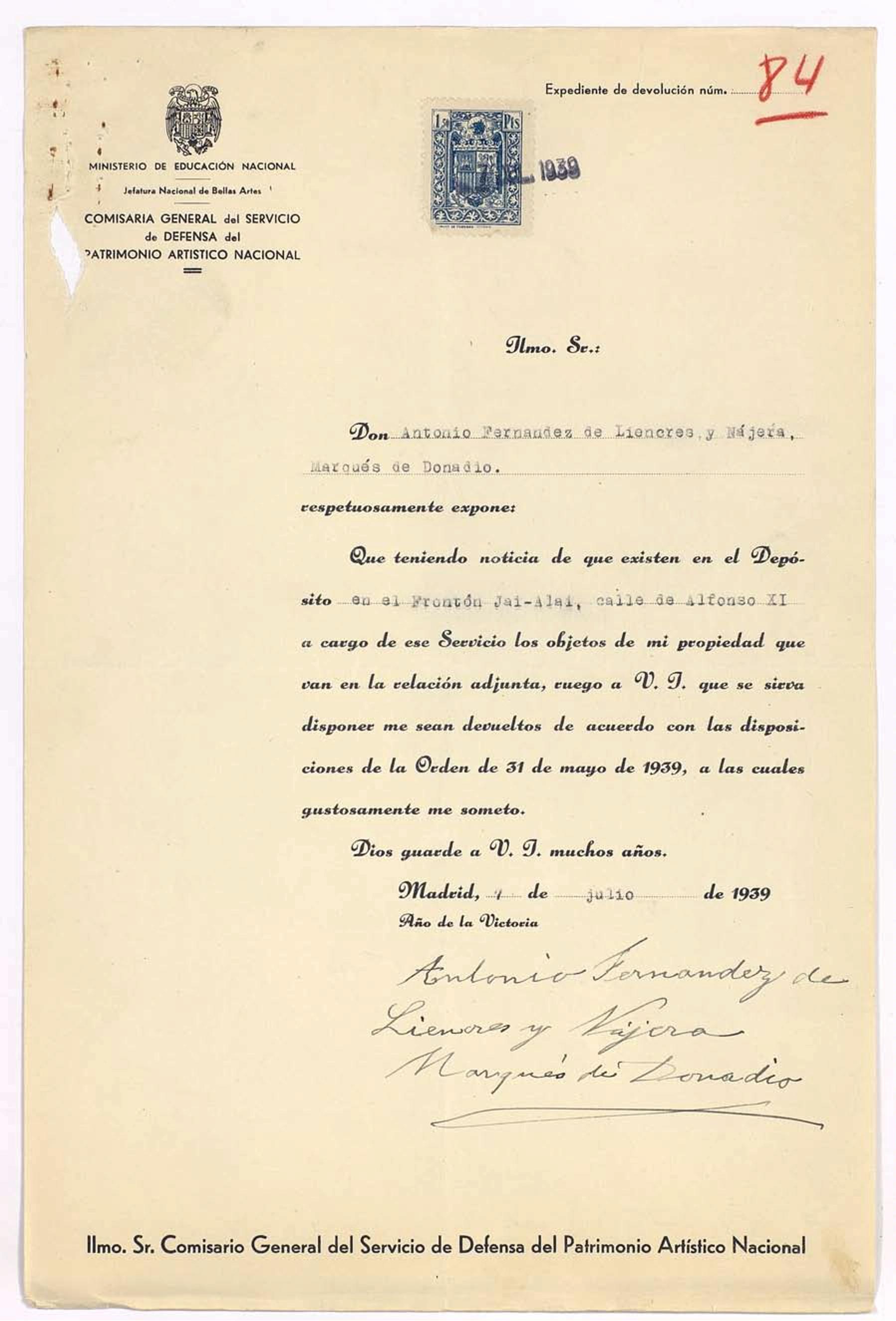 Expediente de devolución de Antonio Fernández de Liencres y Nájera, marqués de Donadio