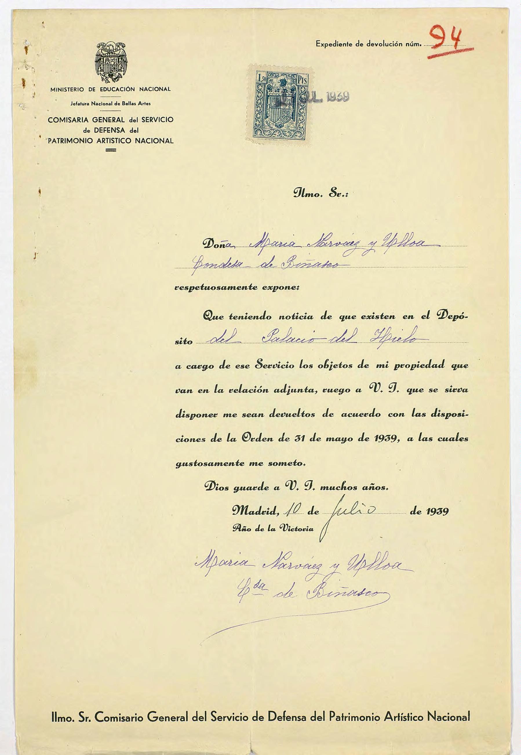 Expediente de devolución de María Narváez y Ulloa, condesa de Biñasco
