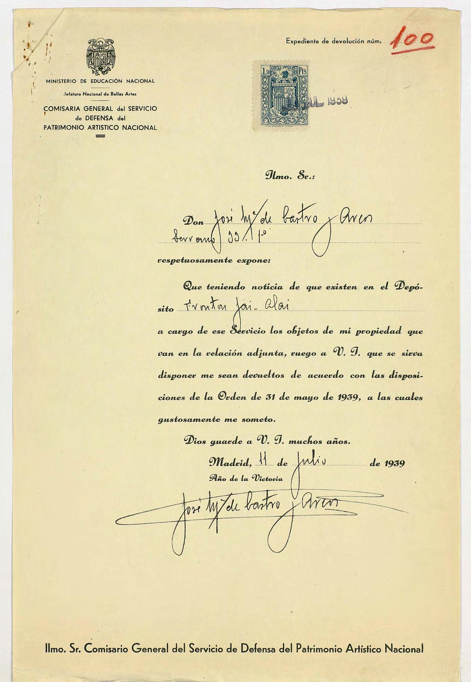 Expediente de devolución de José María de Castro y Arcos