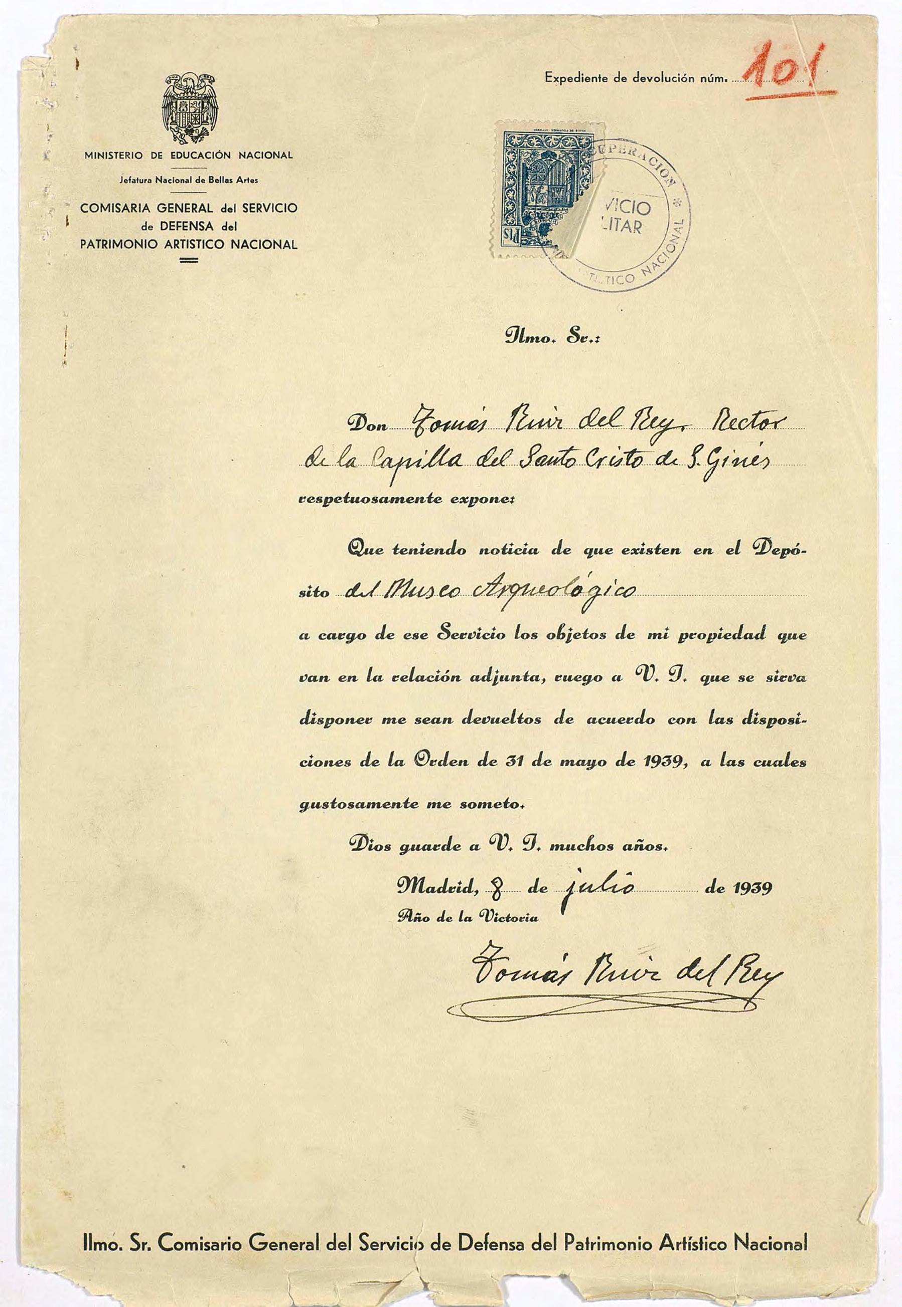 Expediente de devolución de Tomás Ruiz del Rey, rector de la capilla del Santo Cristo de San Ginés (Madrid)