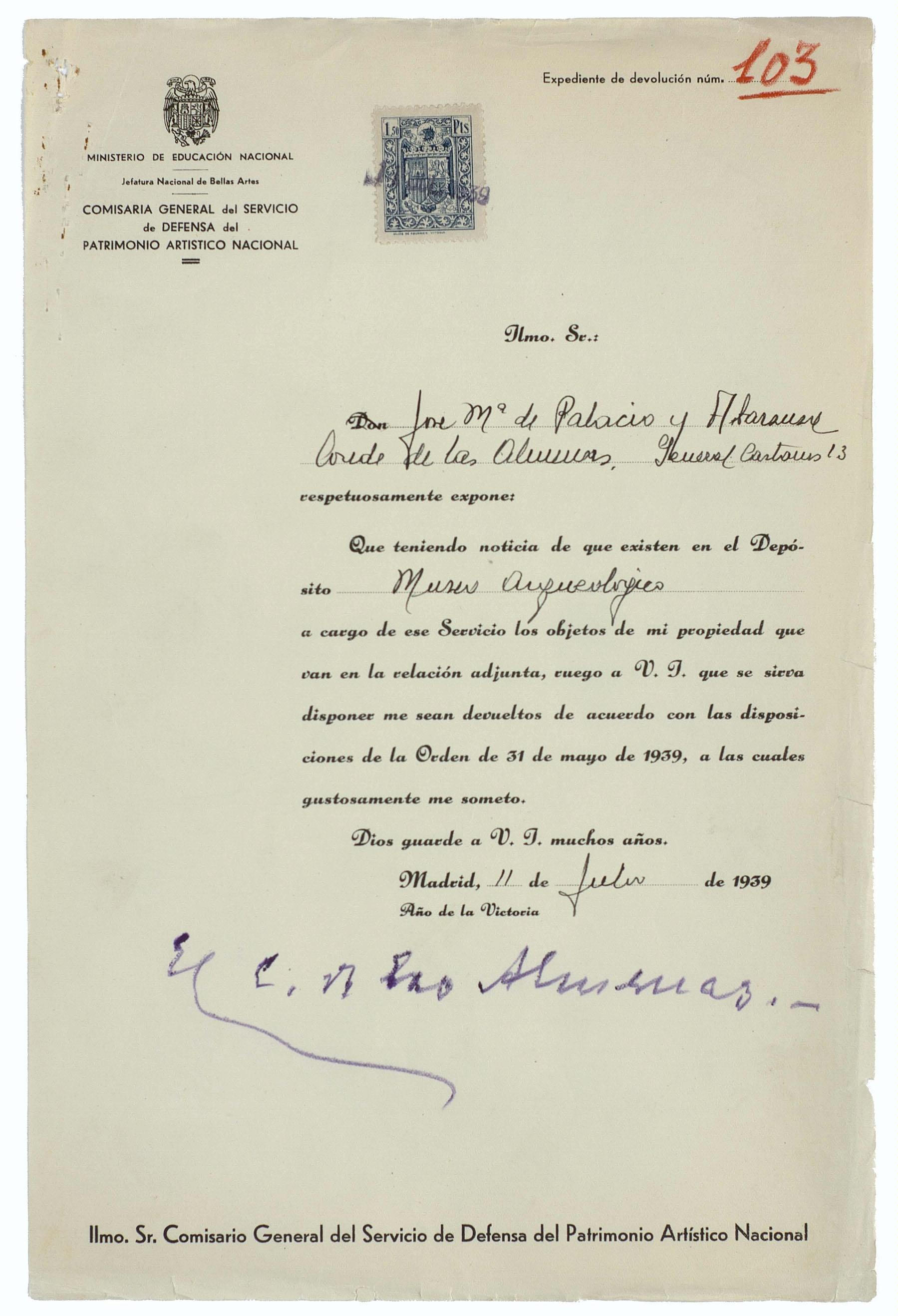 Expediente de devolución de José María de Palacio y Abarzuza, conde de las Almenas