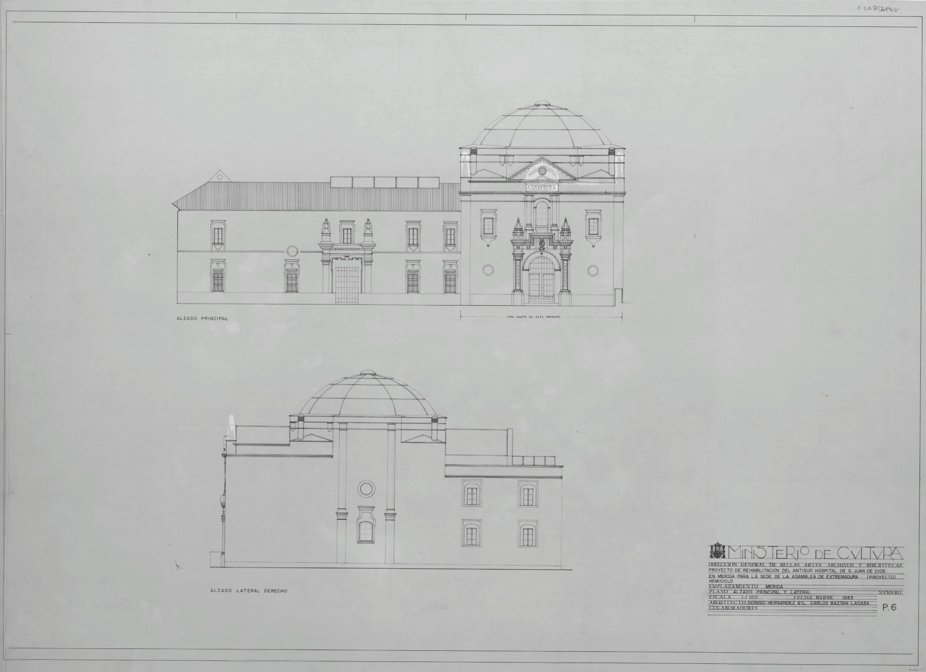 ASAMBLEA DE EXTREMADURA PROYECTO DE REHABILITACIÓN DEL ANTIGUO HOSPITAL DE S. JUAN DE DIOS PARA SEDE DE LA ASAMBLEA: ALZADO PRINCIPAL Y LATERAL Figura en sello "PROYECTO HEMICICLO" Con llamada determinando el objeto de este proyecto Sin firmar