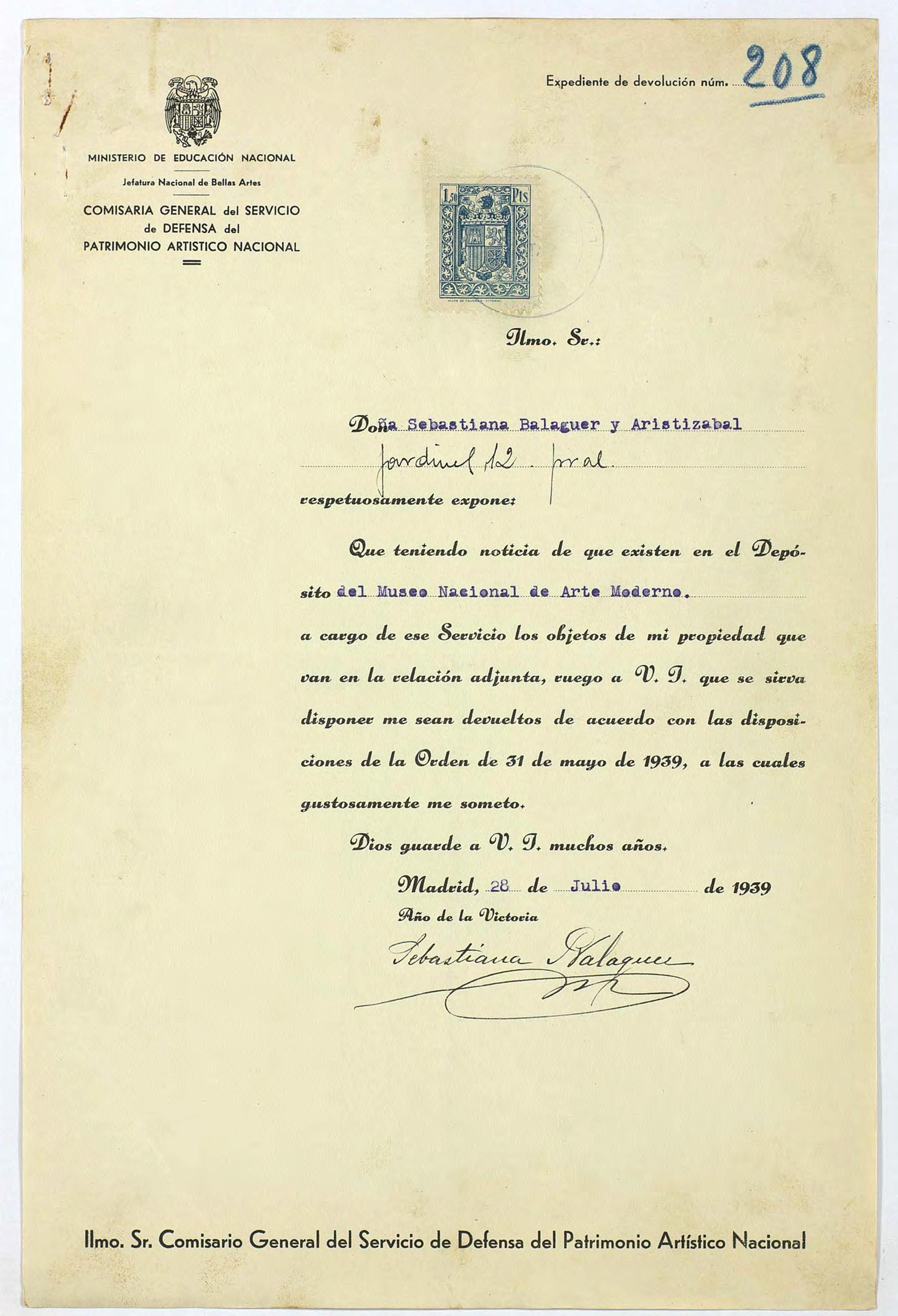 Expediente de devolución de Sebastiana Balaguer y Aristizabal