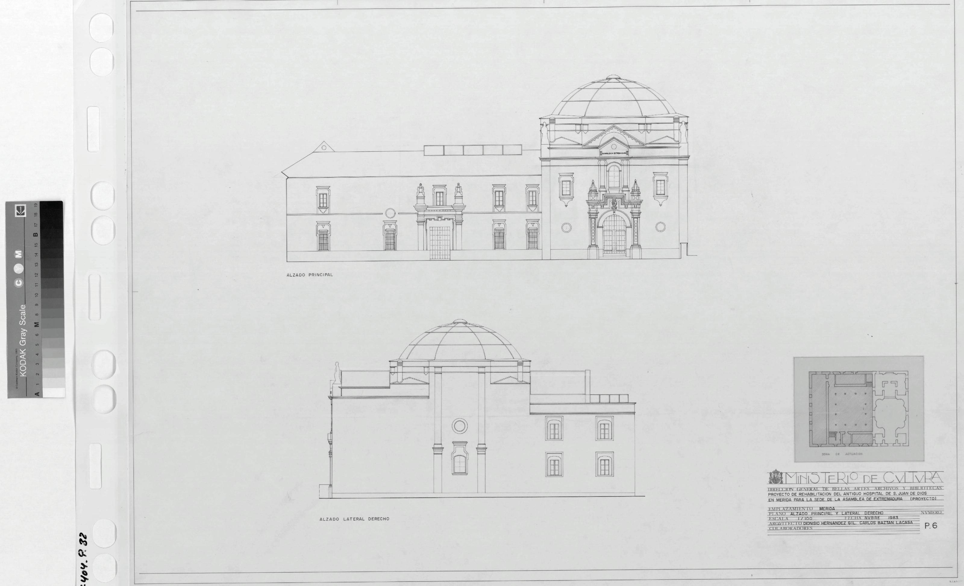 ASAMBLEA DE EXTREMADURA PROYECTO DE REHABILITACIÓN DEL ANTIGUO HOSPITAL DE S. JUAN DE DIOS PARA SEDE DE LA ASAMBLEA: ALZADO PRINCIPAL Y LATERAL DERECHO Figura en sello "PROYECTO " Buen detalle en línea fina de recercados y volúmenes Con dibujo en planta a pequeña escala determinando zona de actuación. Sin firmar