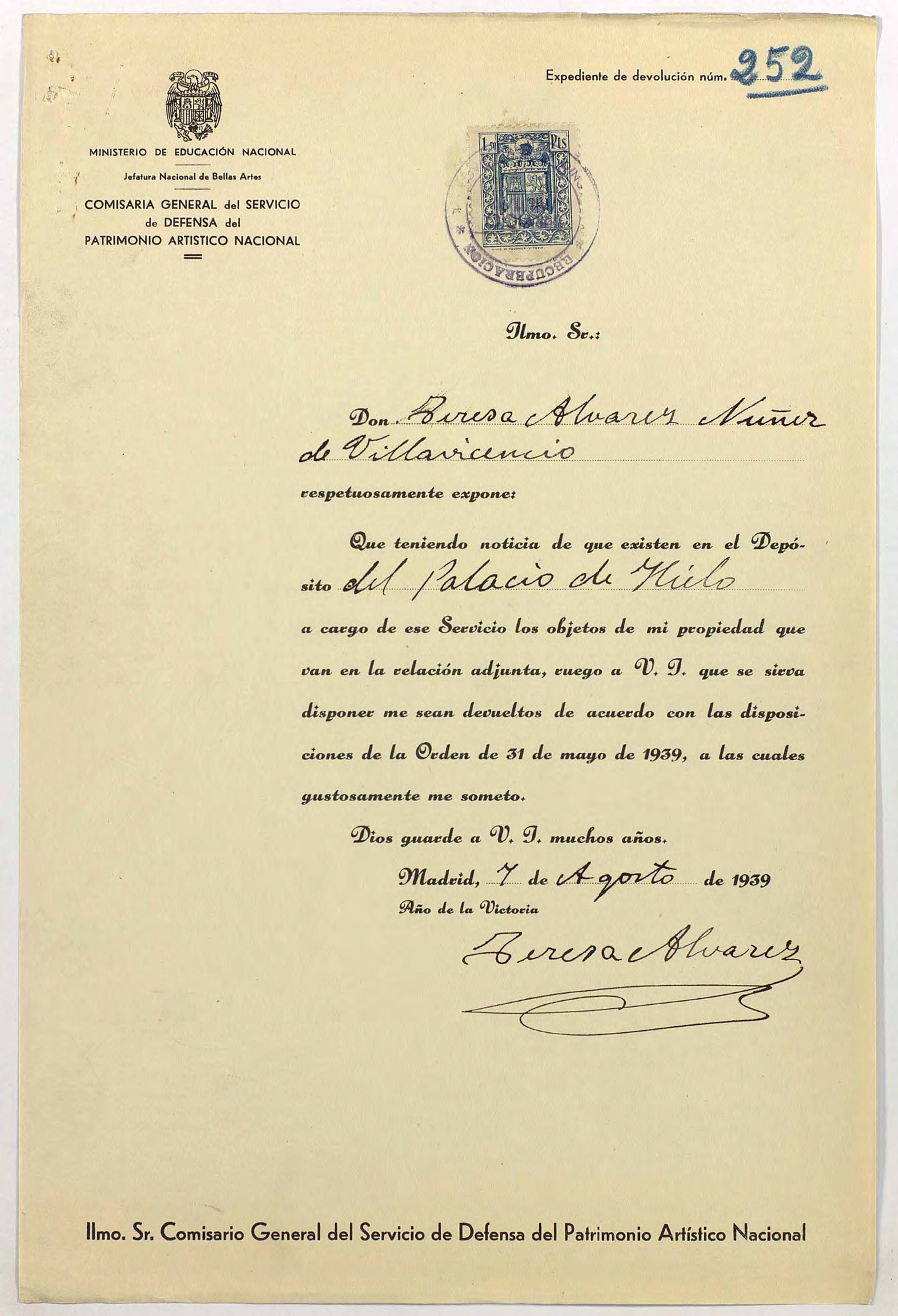 Expediente de devolución de Teresa Álvarez Núñez de Villavicencio