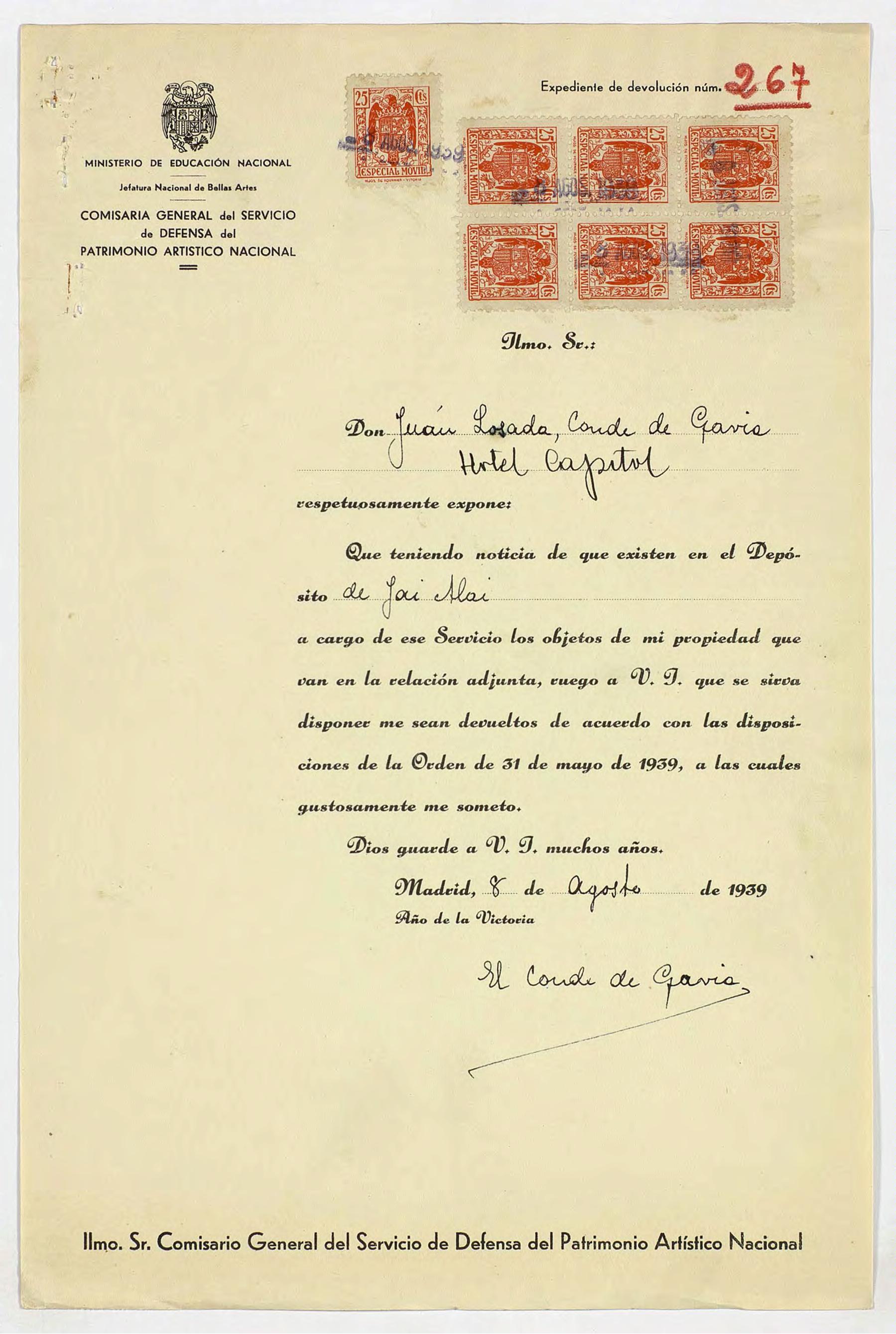 Expediente de devolución de Juan Losada, conde de Gavia, marqués de los Castellones