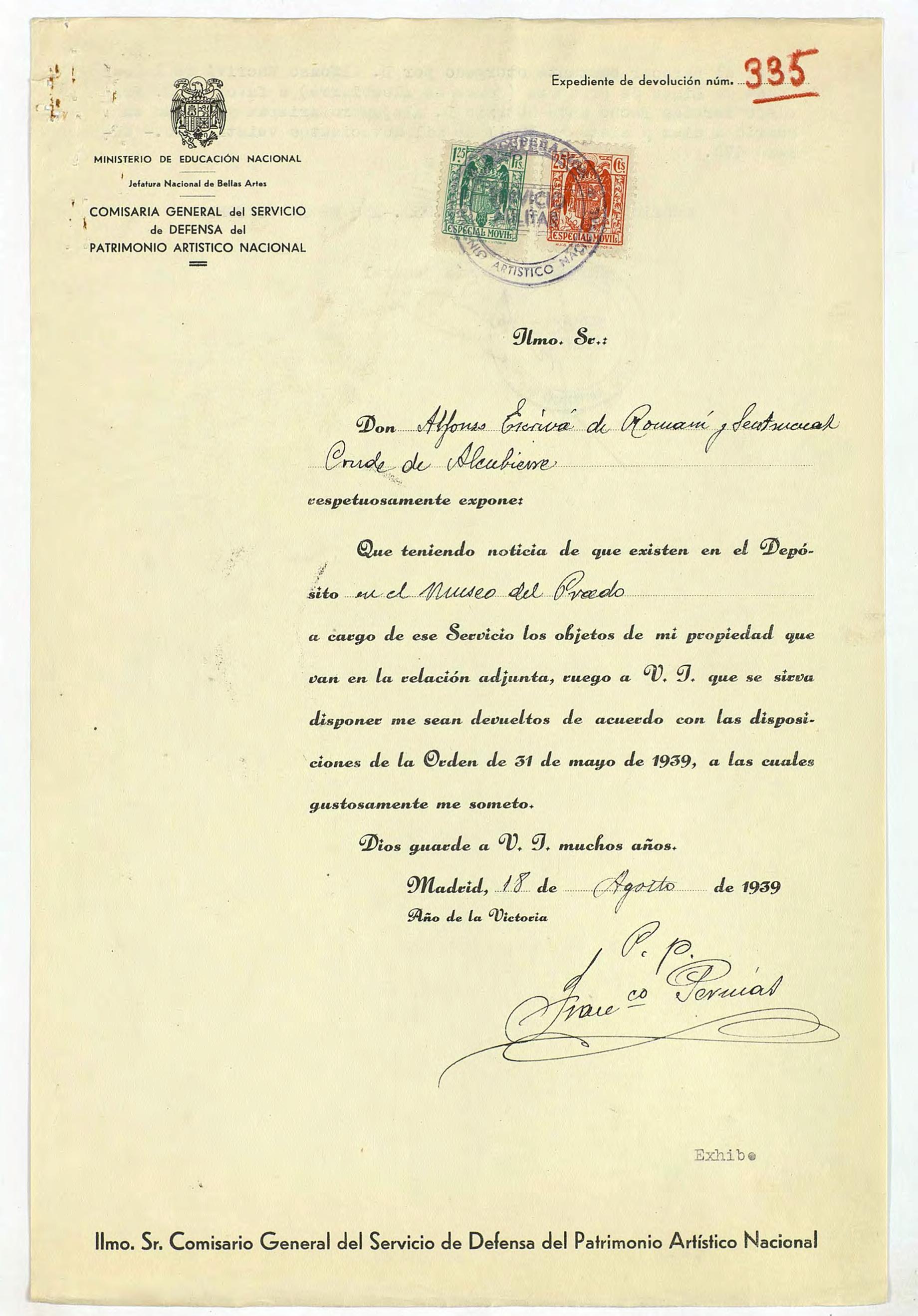 Expediente de devolución de Alfonso Escrivá de Romaní, conde de Alcubierre