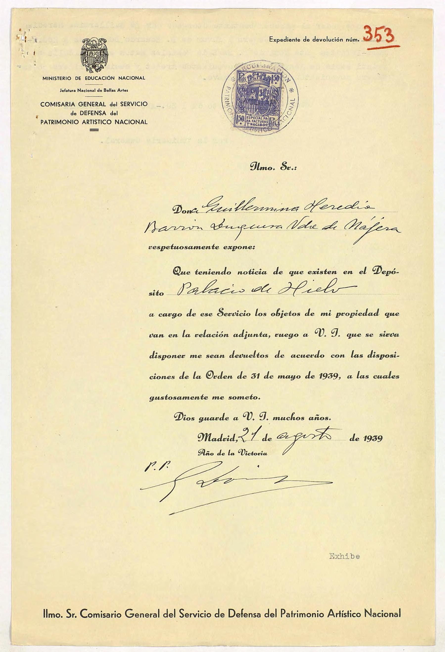 Expediente de devolución de Guillermina Heredia Barrón, duquesa viuda de Nájera