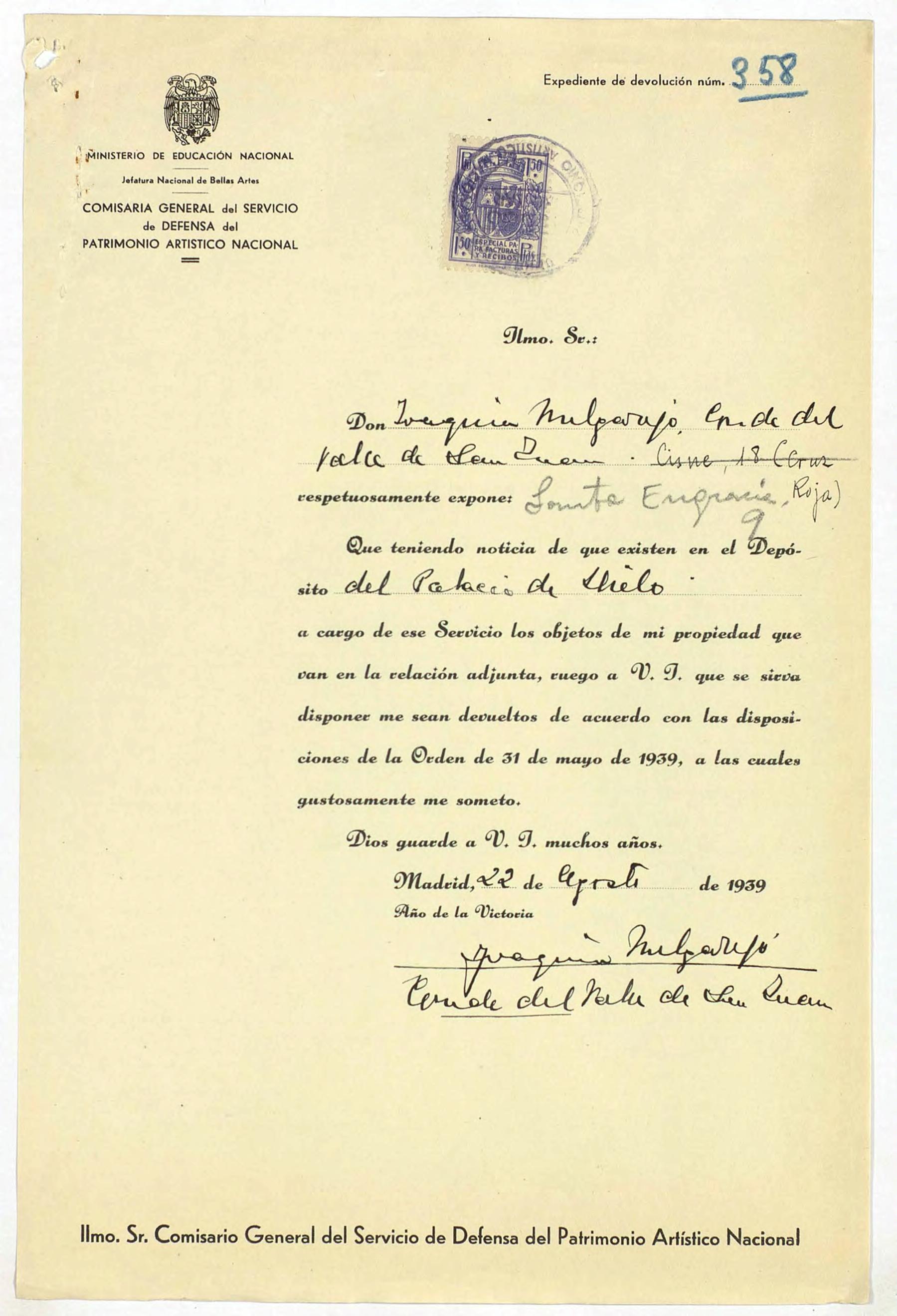 Expediente de devolución de Joaquín Melgarejo y Escario, conde del Valle de San Juan