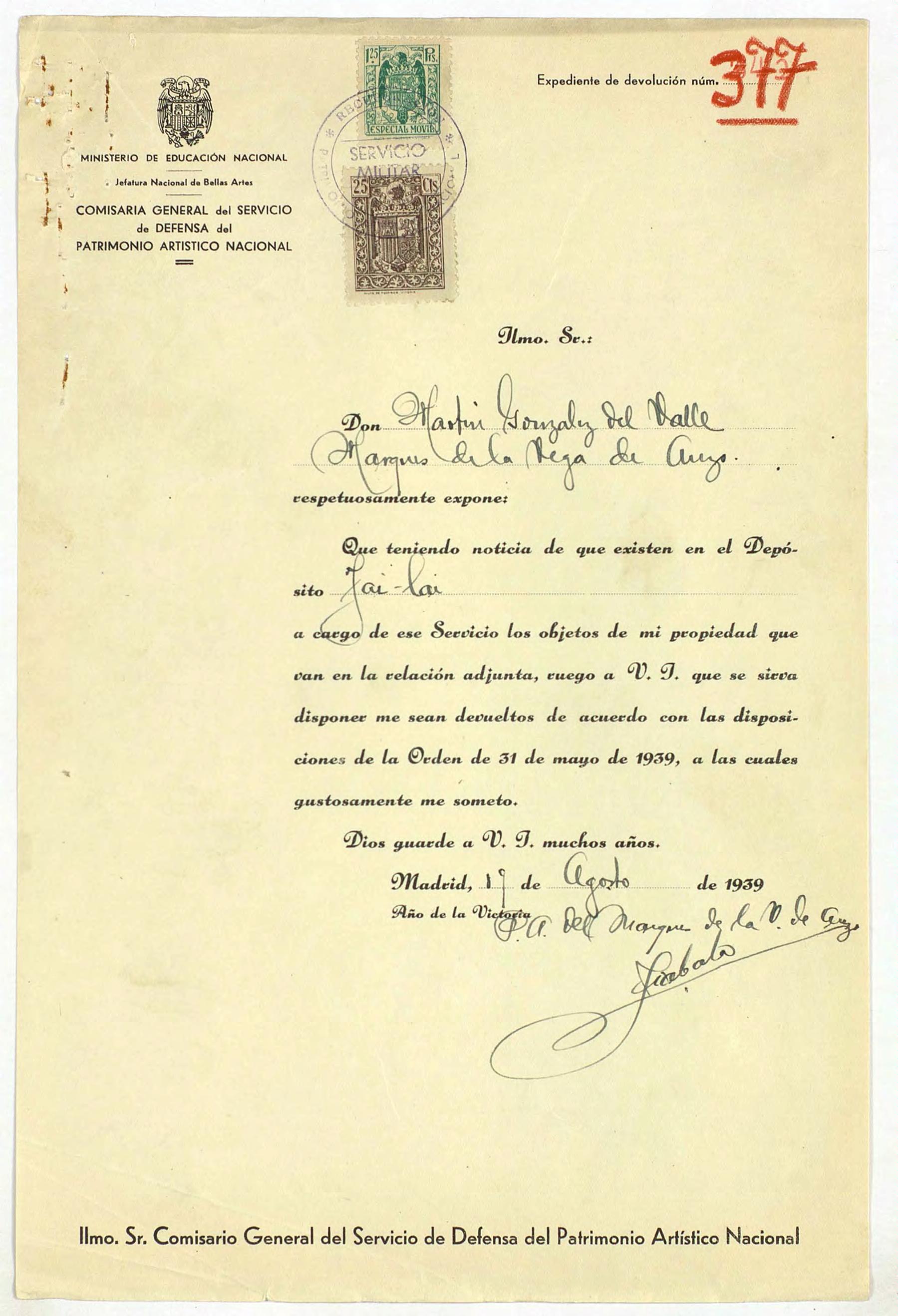 Expediente de devolución de Martín González del Valle y Fernández Miranda, marqués de la Vega de Anzo