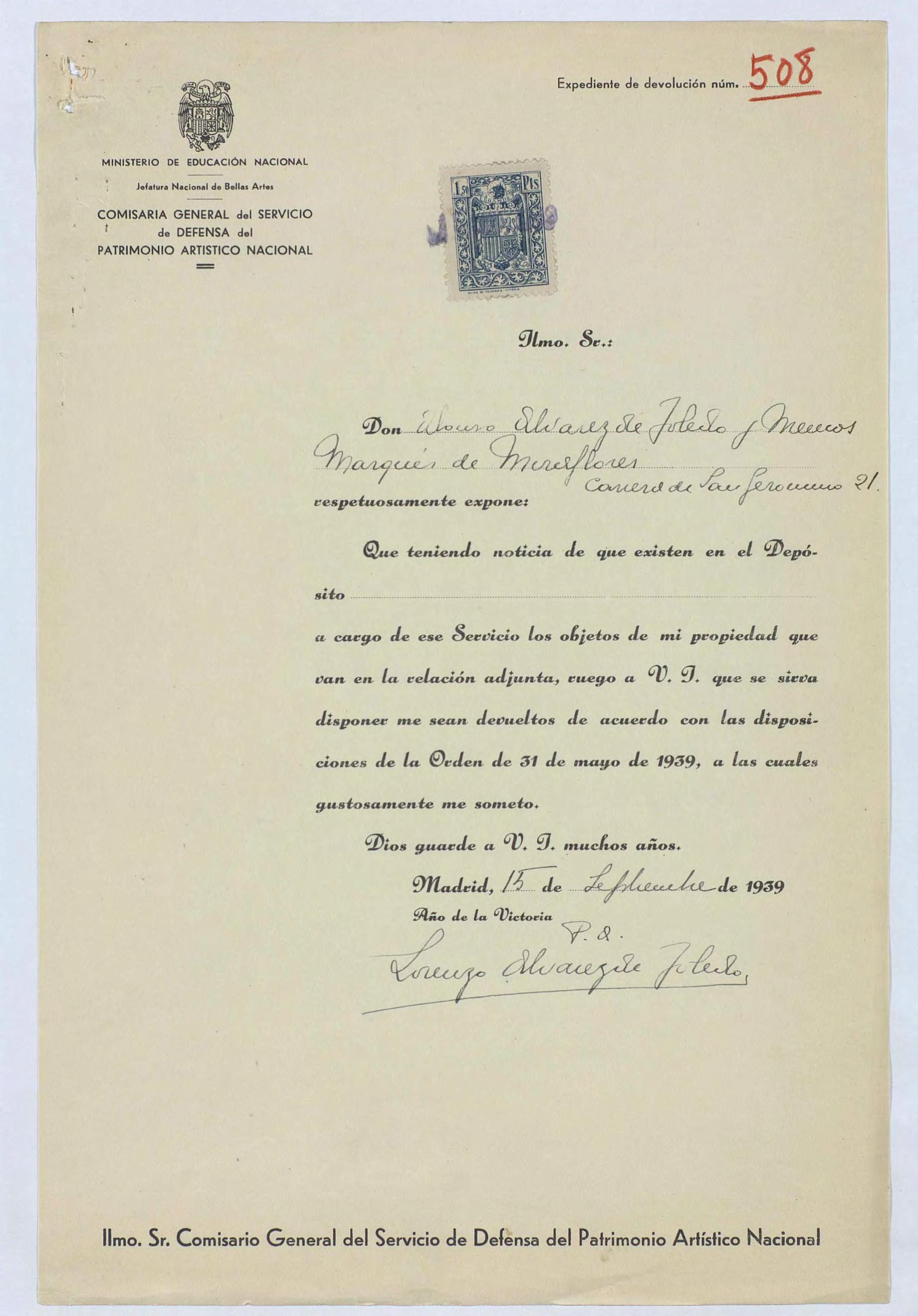 Expediente de devolución de Alonso Álvarez de Toledo, marqués de Miraflores